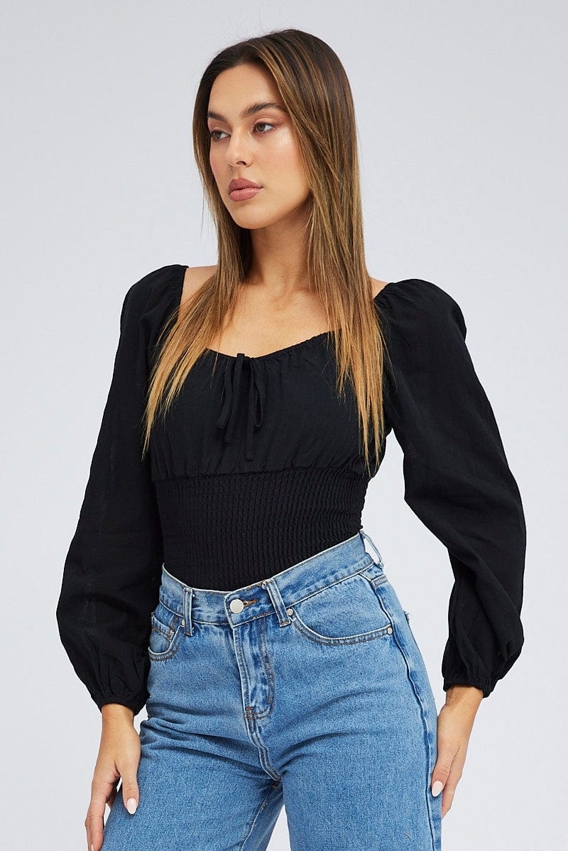 Black Bodysuit Long Sleeve Sweetheart Neck