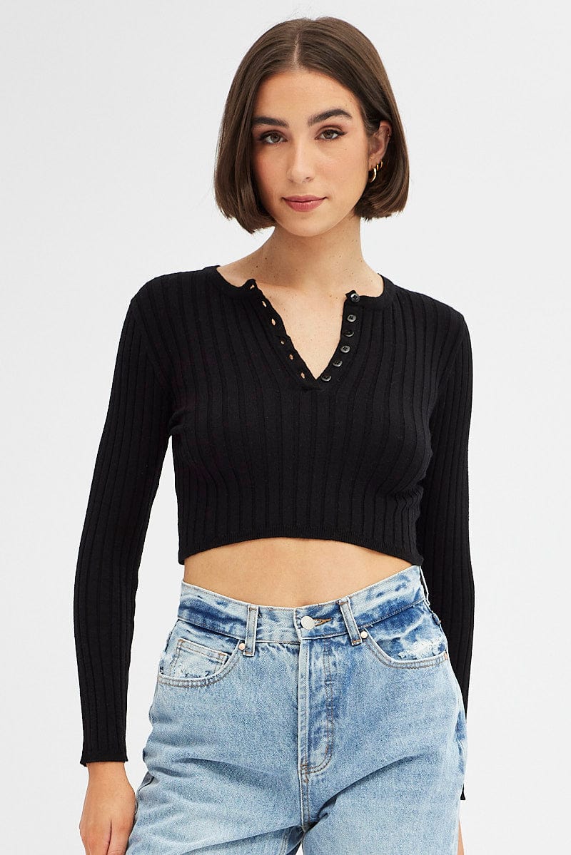 Black Knit Top Long Sleeve Crop