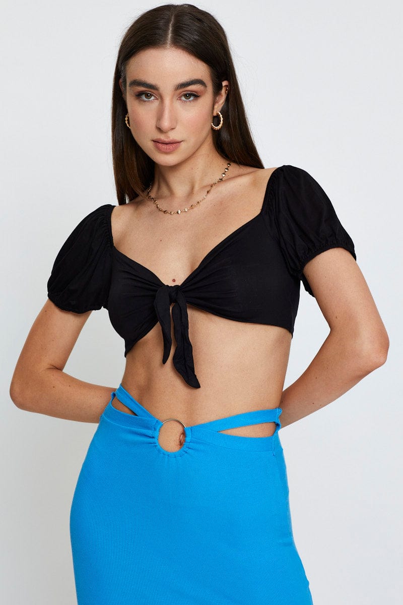 - Cropped Length, Knotted Front, Short Sleeves, Stretch Material