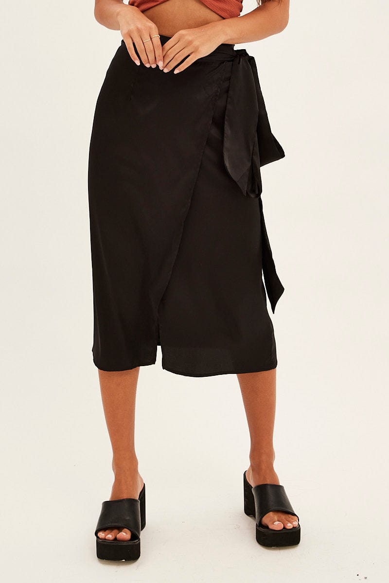 Black Tie Front Satin Midi Skirt