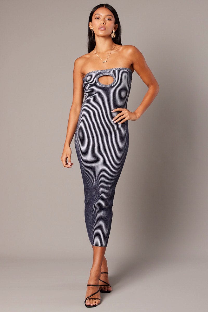 Blue Knit Dress Key Hole Front Bandeau Midi