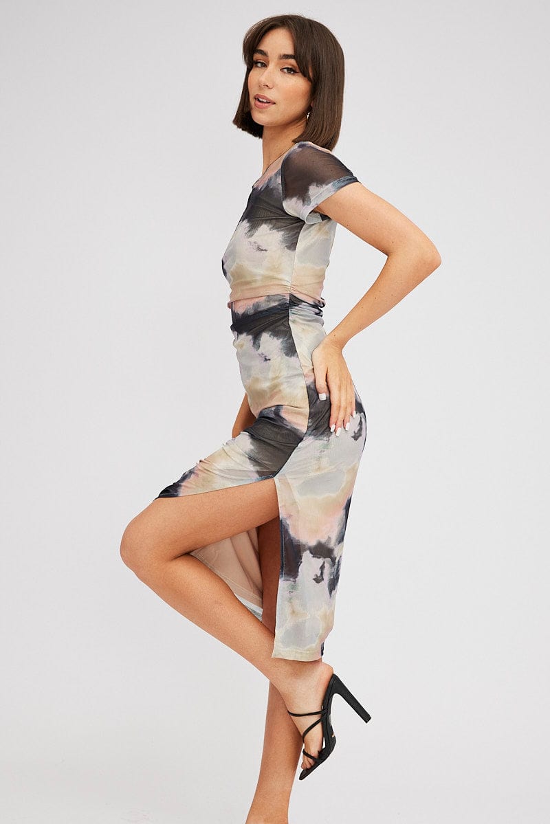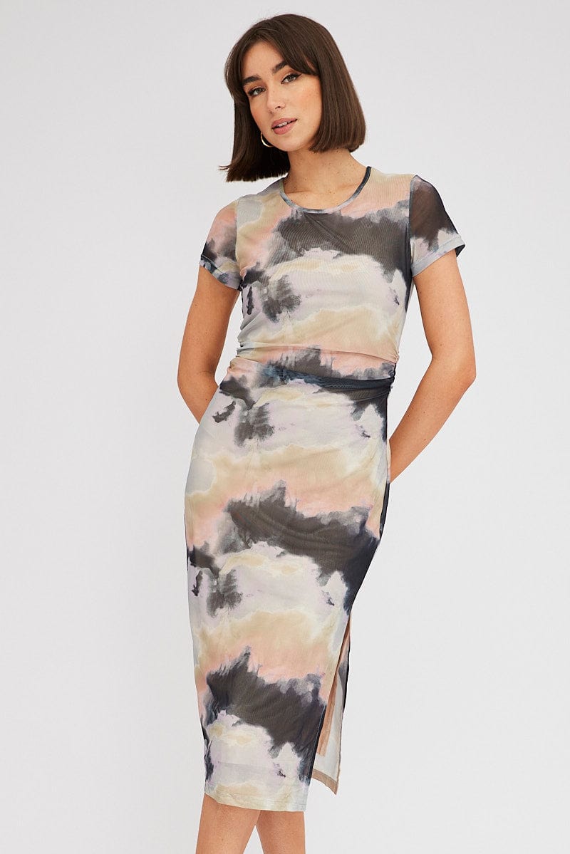 Brown Abstract Midi Dress Short Sleeve Bodycon Mesh