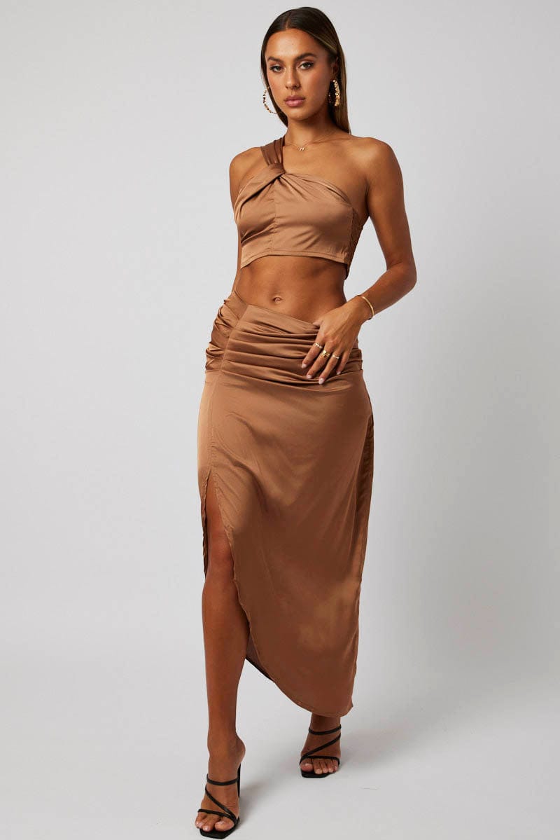 Brown Ruched Maxi Skirt Draped Satin Skirt