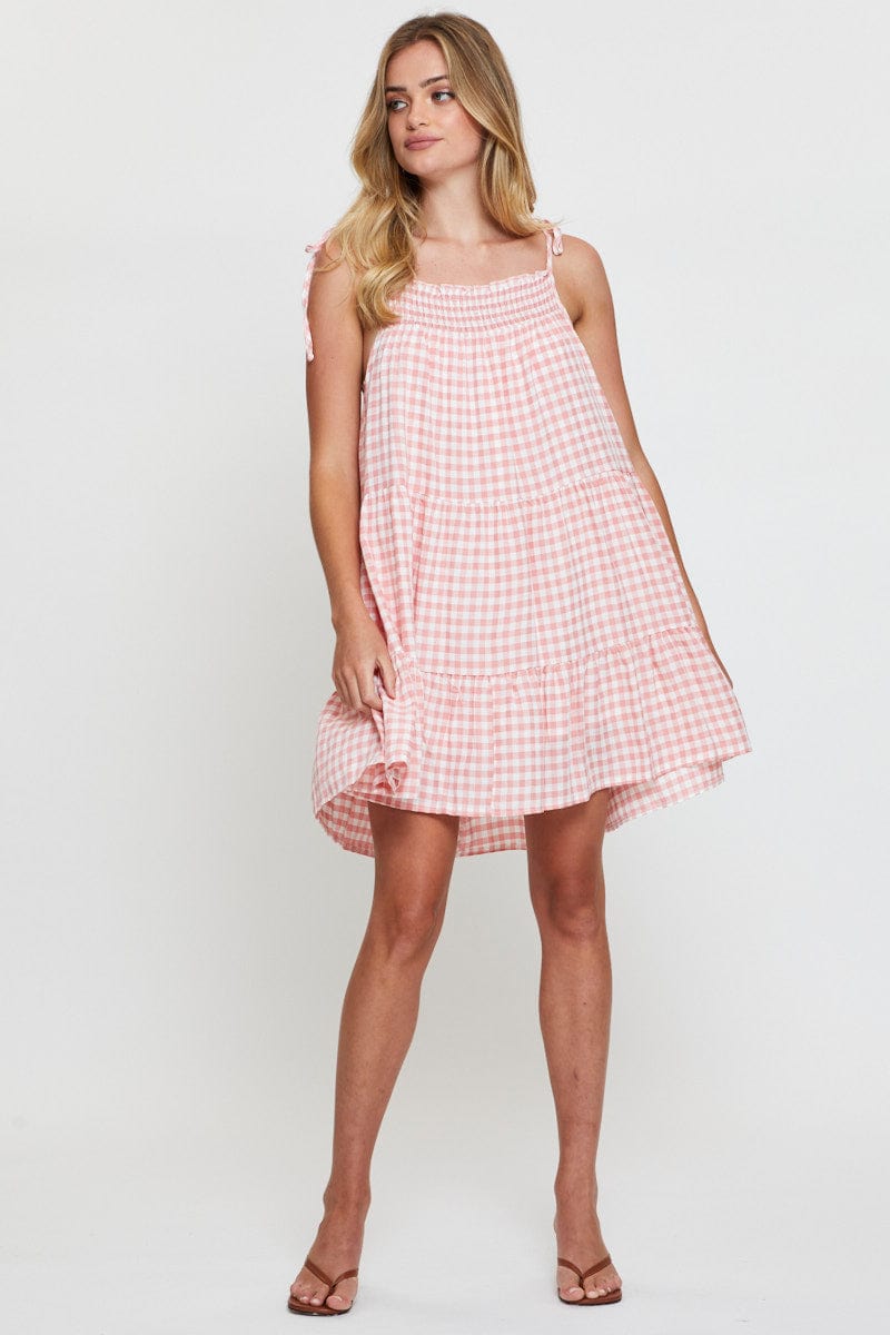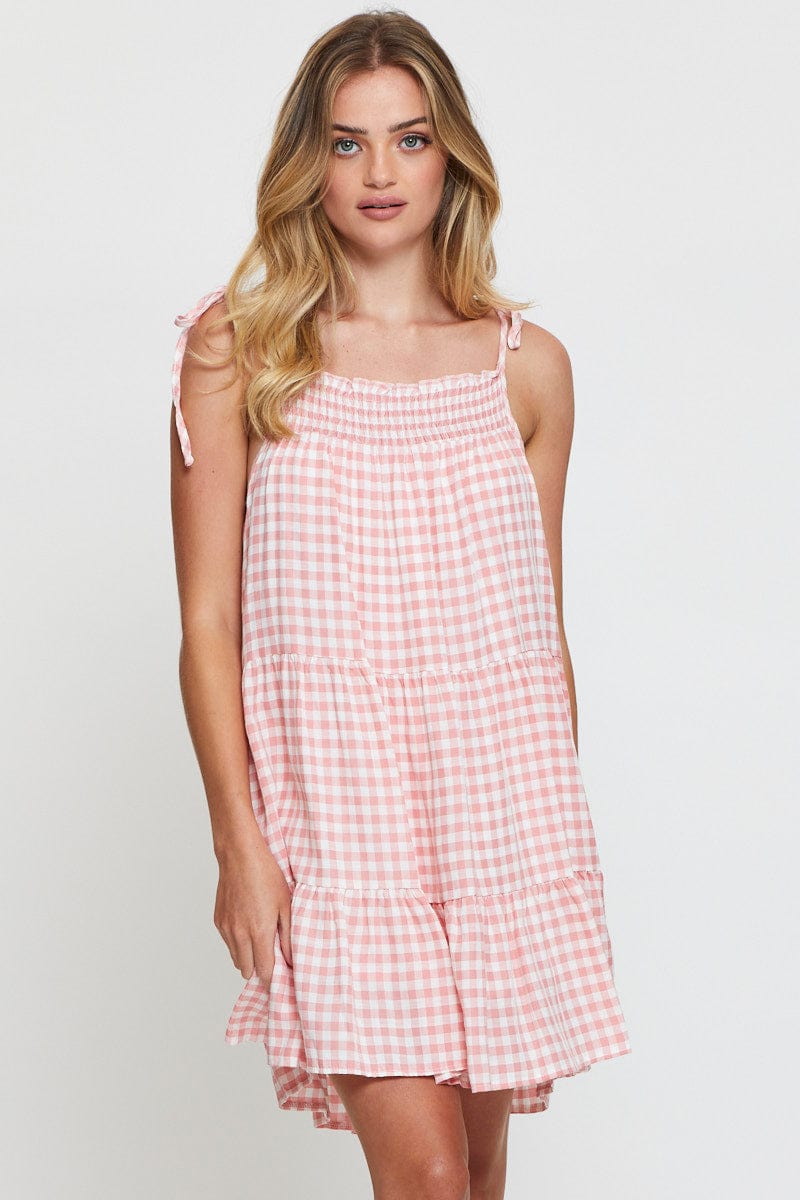 - Gingham Print, Tie Shoulder Straps, Tiered Design, Shirred Neckline