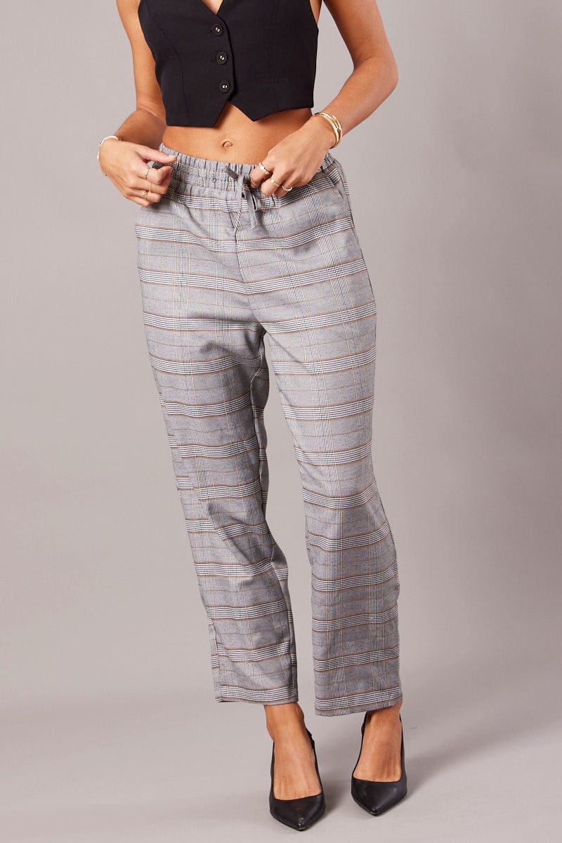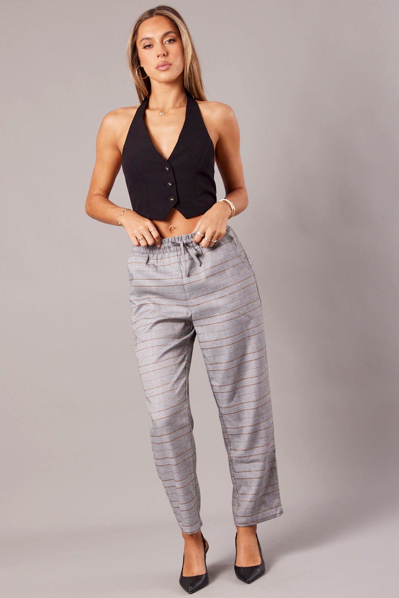 Grey Check Tapered Pants Elasticated Waist Cropped