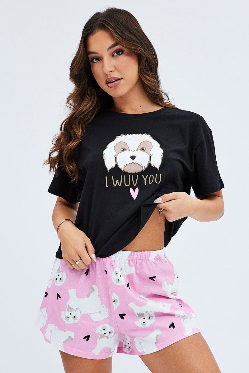 Pink Print Graphic Pj Dog and Hearts Pyjama Set