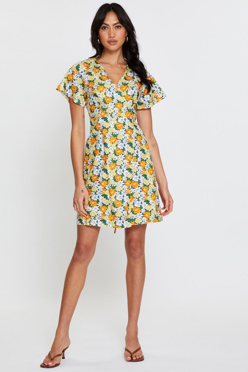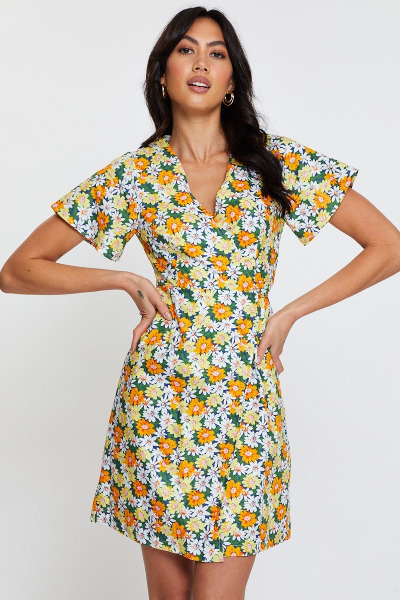- Floral Print, Wrap Design, Mini Length, V Neckline