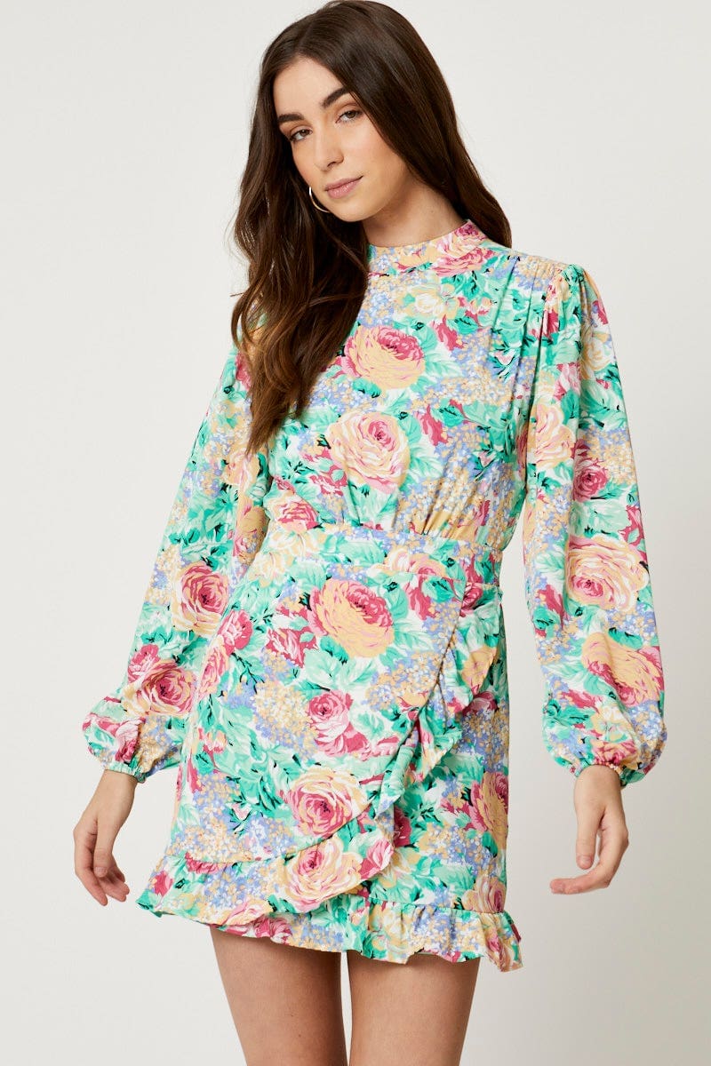 - Pleat Detailing, Floral Print, Wrap Frill Skirt, Balloon Sleeves