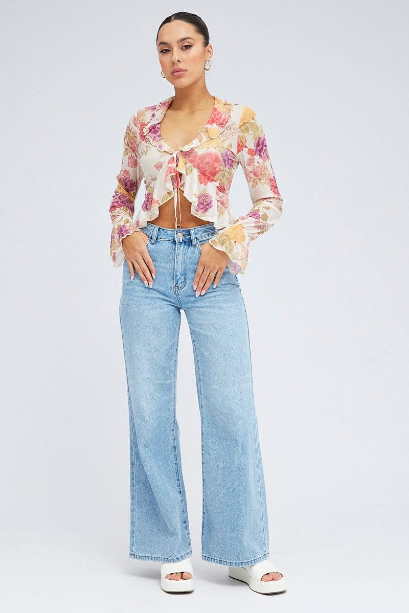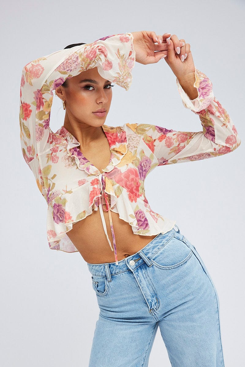 White Floral Bolero Long Sleeve V Neck