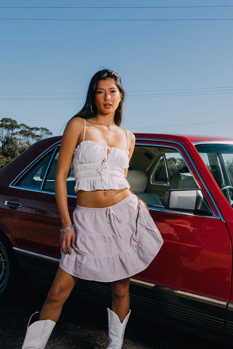 - Gingham Print, Mini Length, Elasticised Waist, Front Tie Up