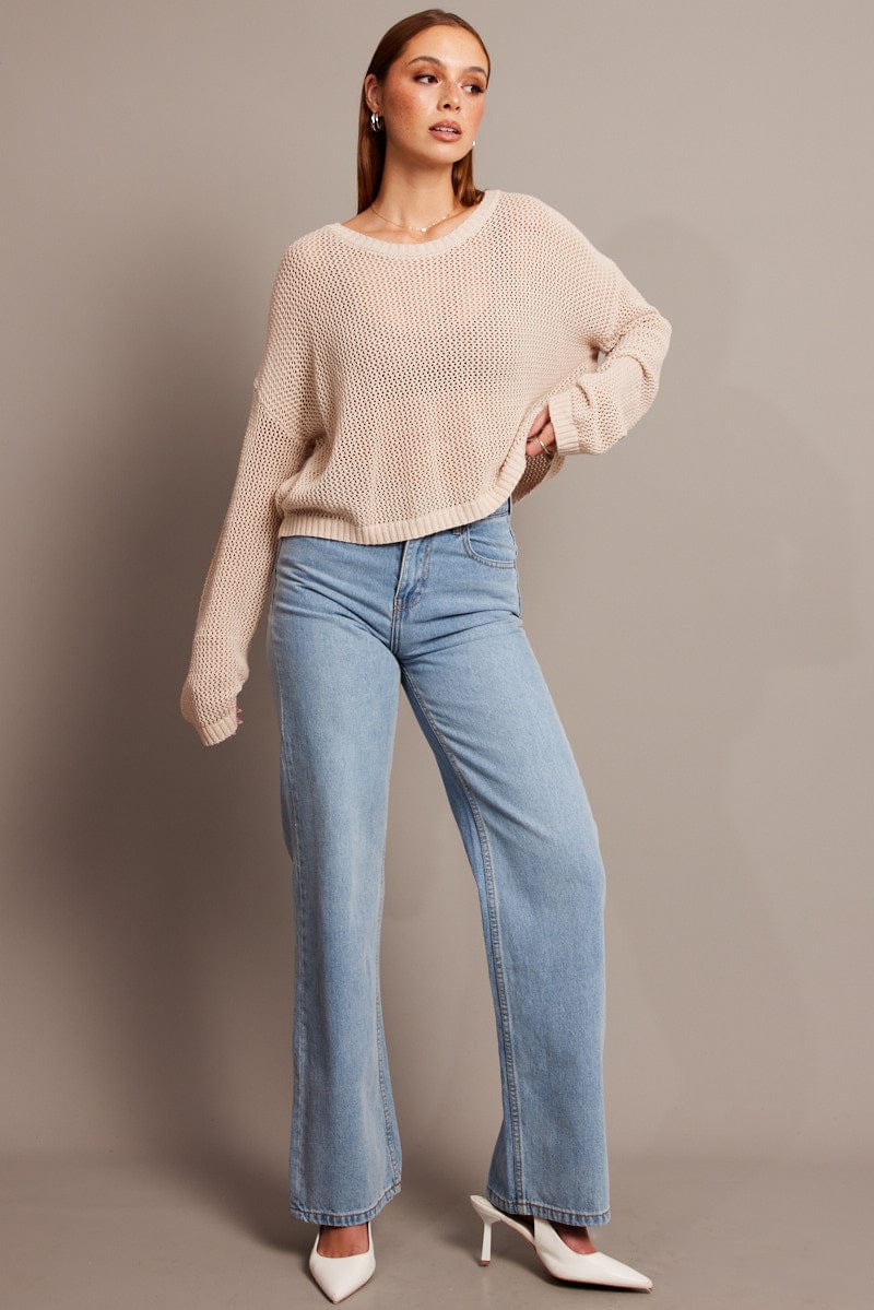 Beige Crochet Knit Top Boat Neck Long Sleeve