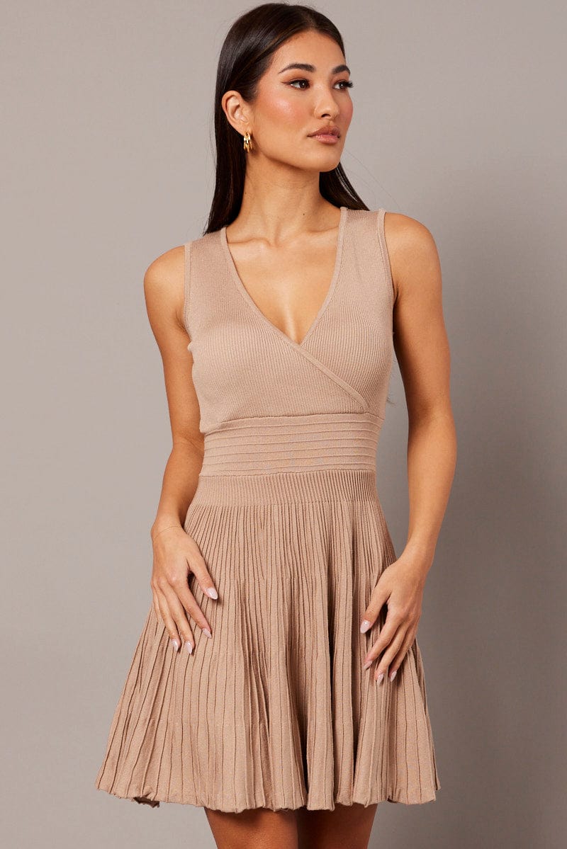 - Knitted, Surplice Neckline, Gathered Waist, Pleated Skirt