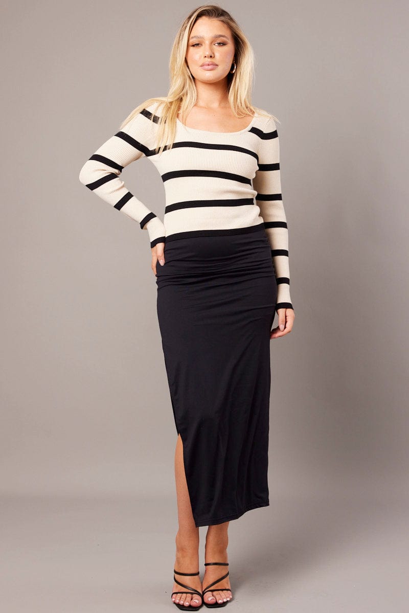 Beige Stripe Knit Top Long Sleeve Scoop Neck