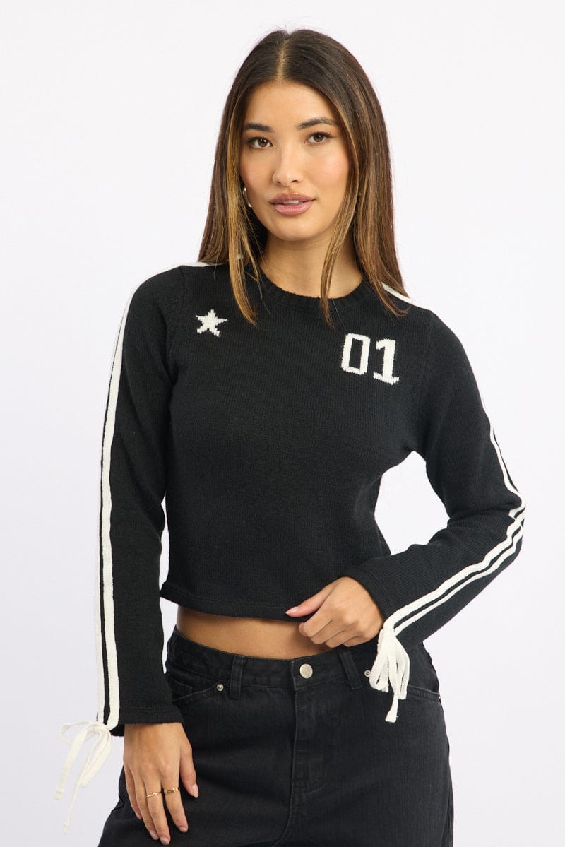 Black Crop Knit Top Long Sleeve Varsity Contrast Trim