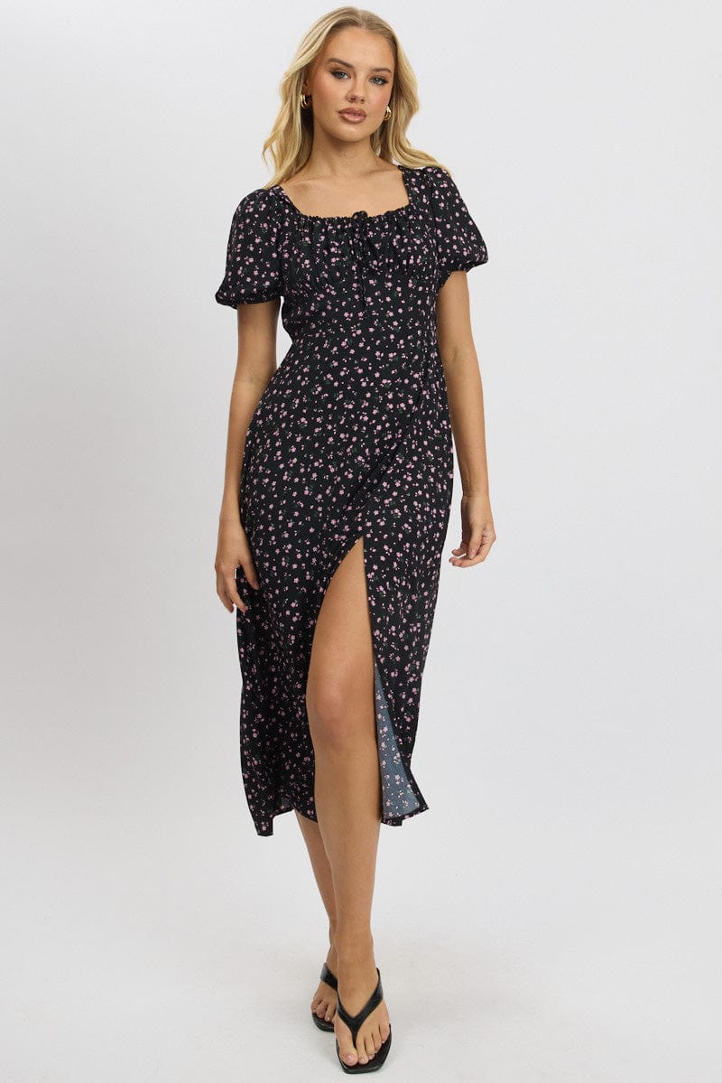 Black Ditsy Midi Dress Short Sleeve Side Split