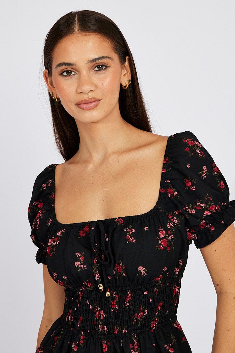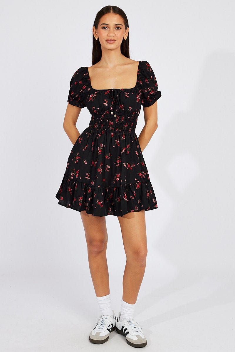 Black Floral Fit And Flare Dress Puff Sleeve Mini