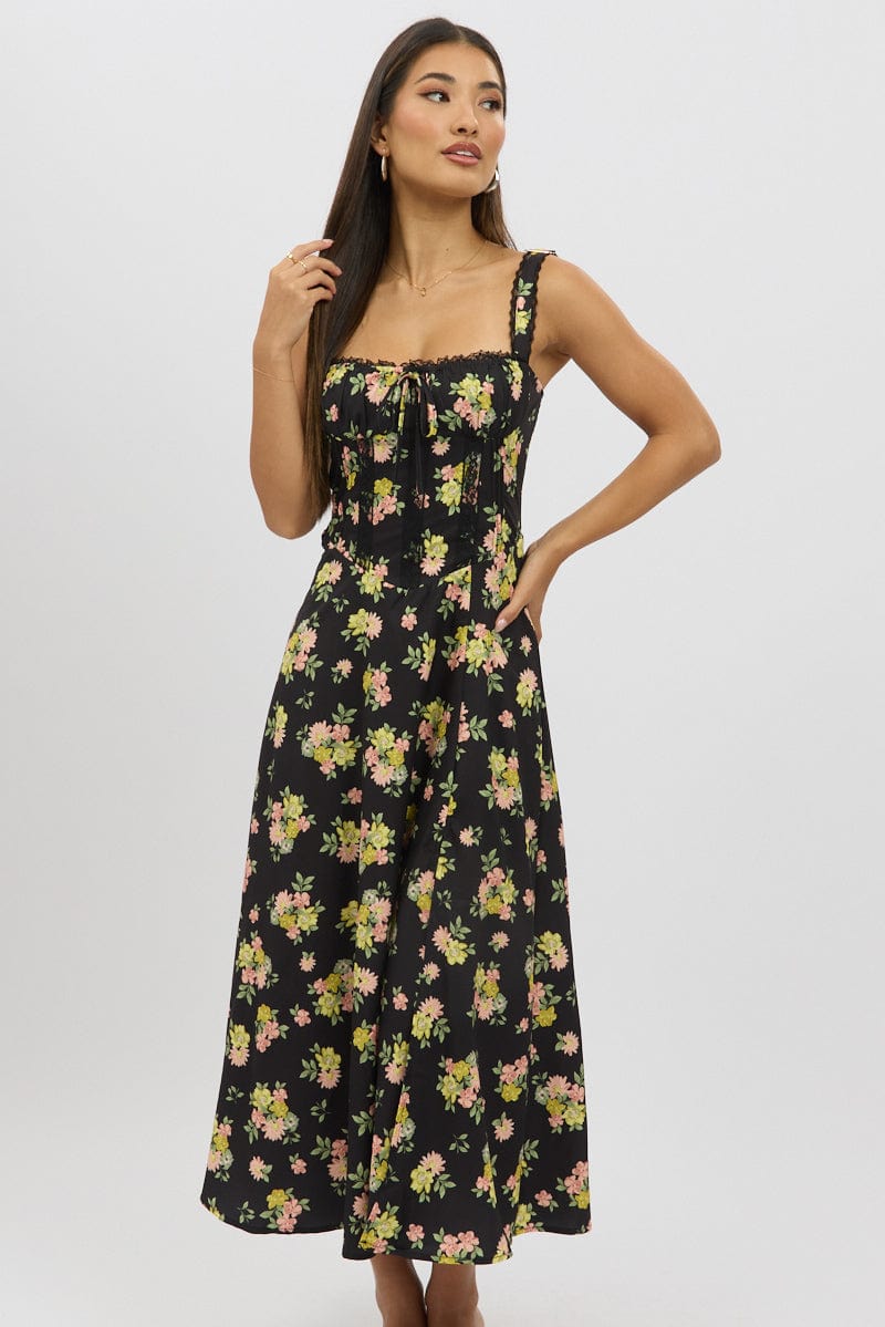 - Gathered Bust, Corset-Look Bodice, Side Split, Lined