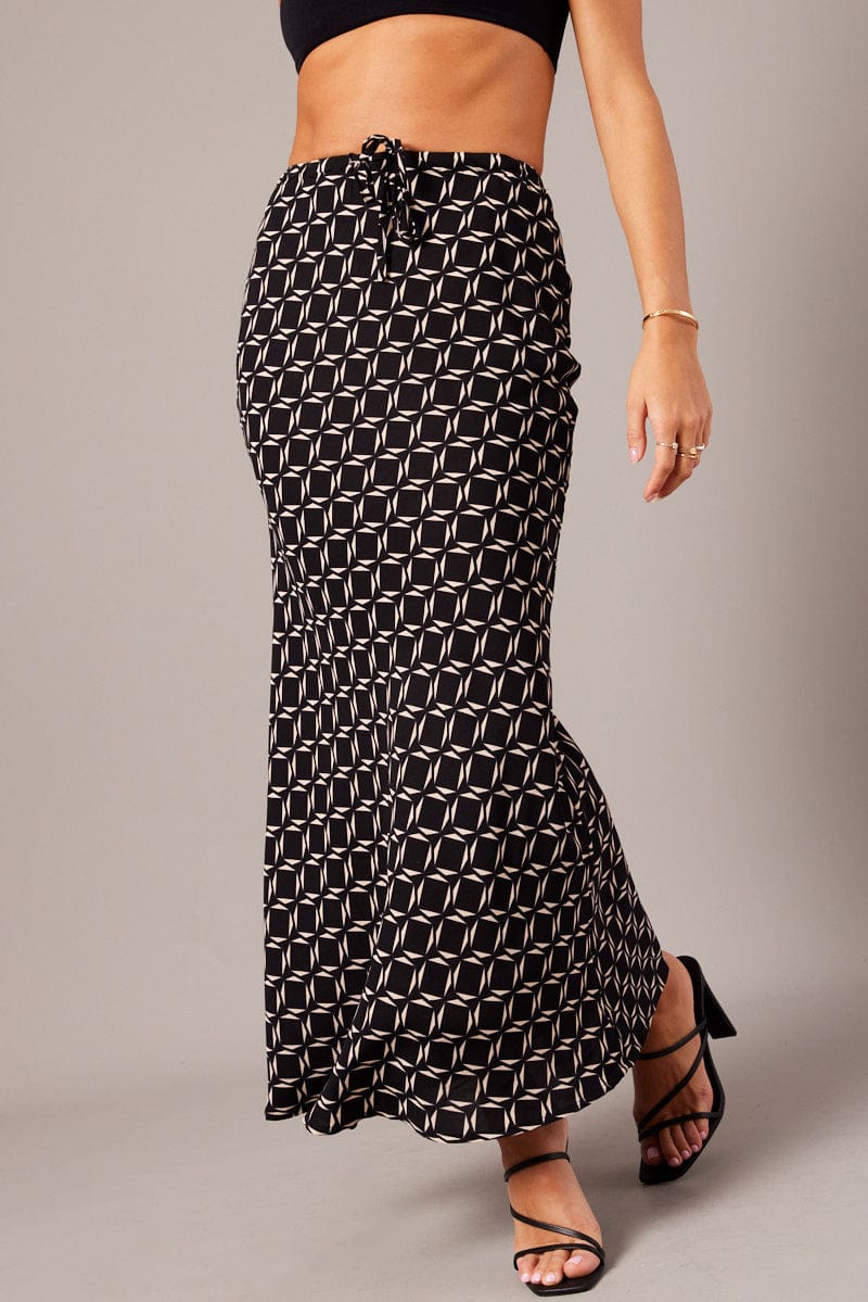Black Geo Slip Skirt Maxi Drawstring Waist
