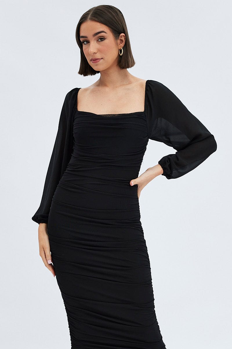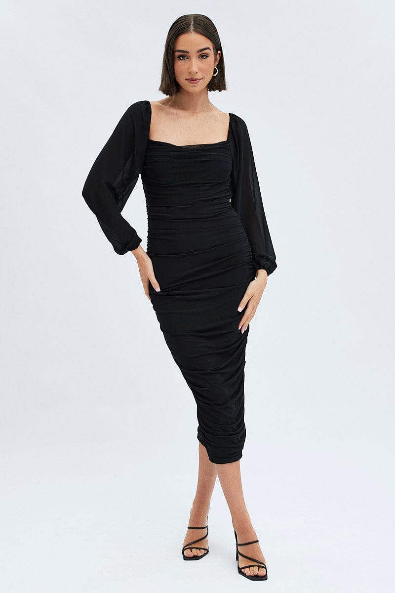 Black Midi Dress Long Sleeve Square Neck Ruched Bodycon