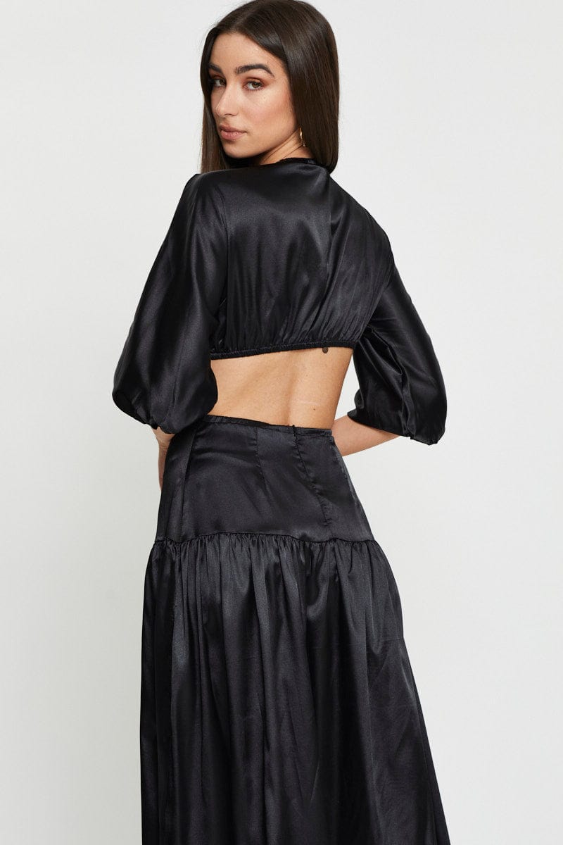 - Satin Finish, Cut Out Detail, Midi Length, Puff Sleeves