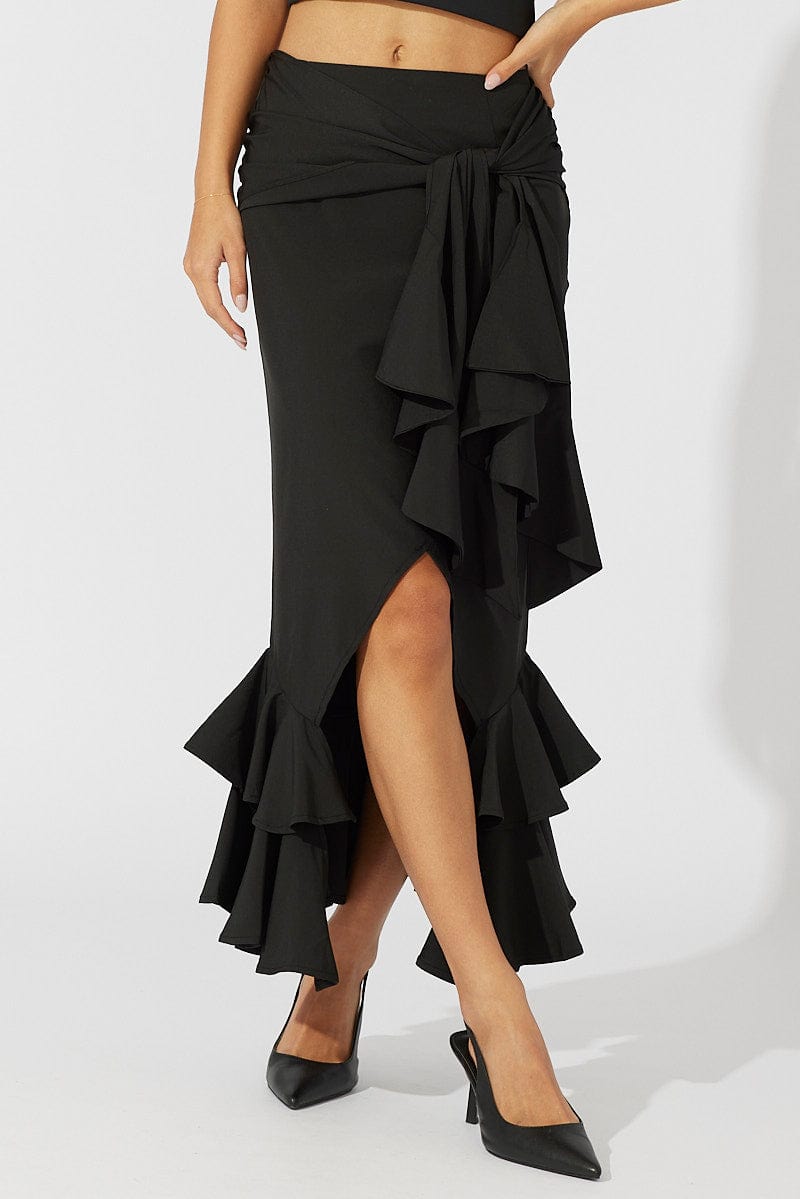 - Ruffle Detail, Waist Tie, Hem Split, Back Zipper
