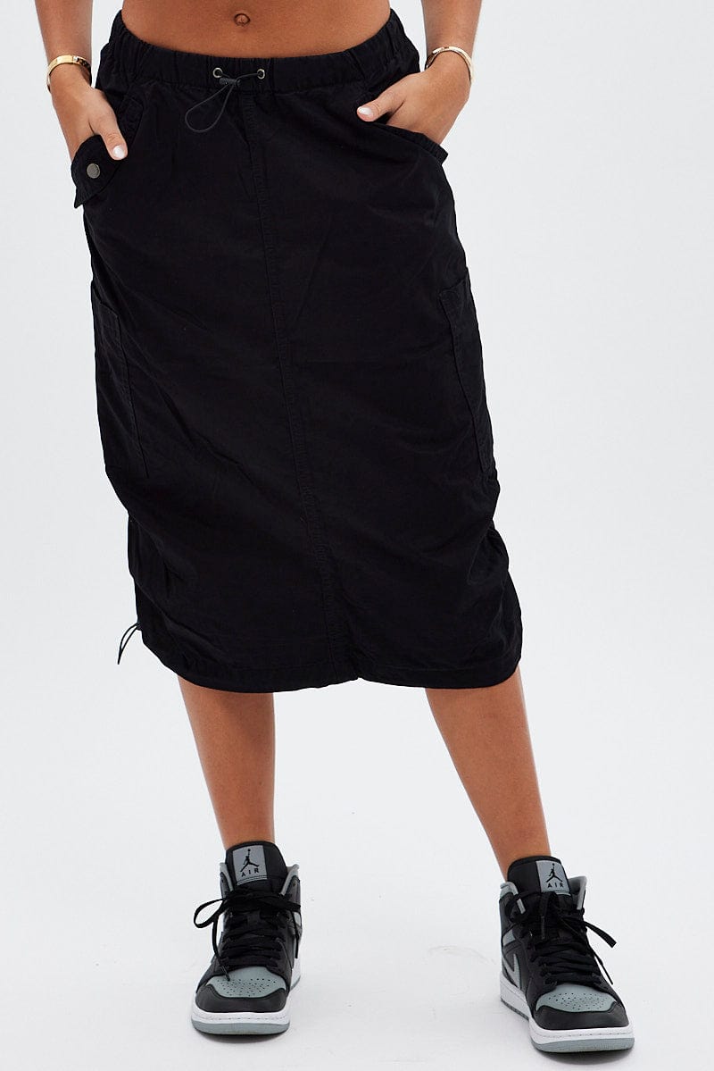 Black Midi Skirt Mid Rise Cargo Drawstring Elastic Waist