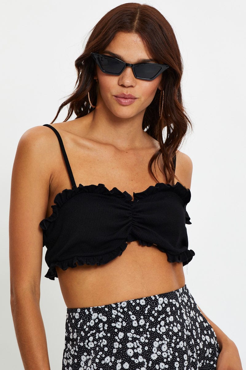 Black Ruched Frill Detail Ribbed Crop Top