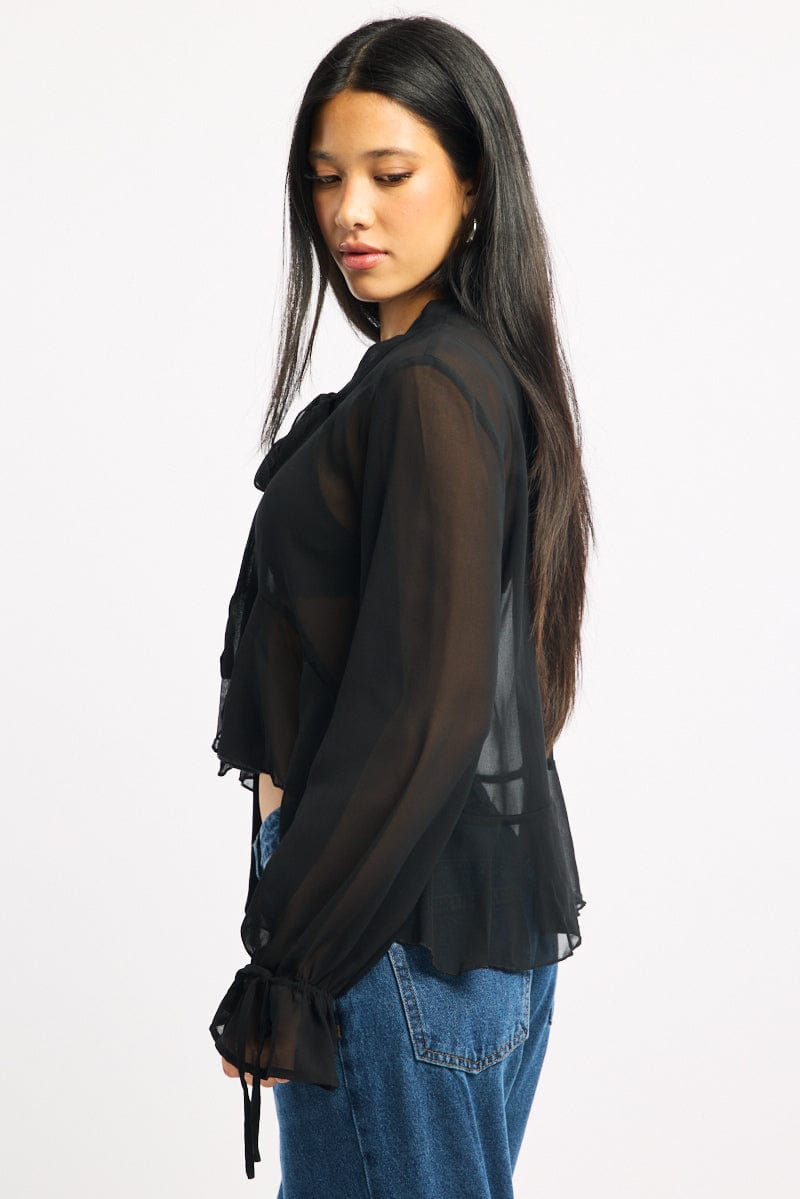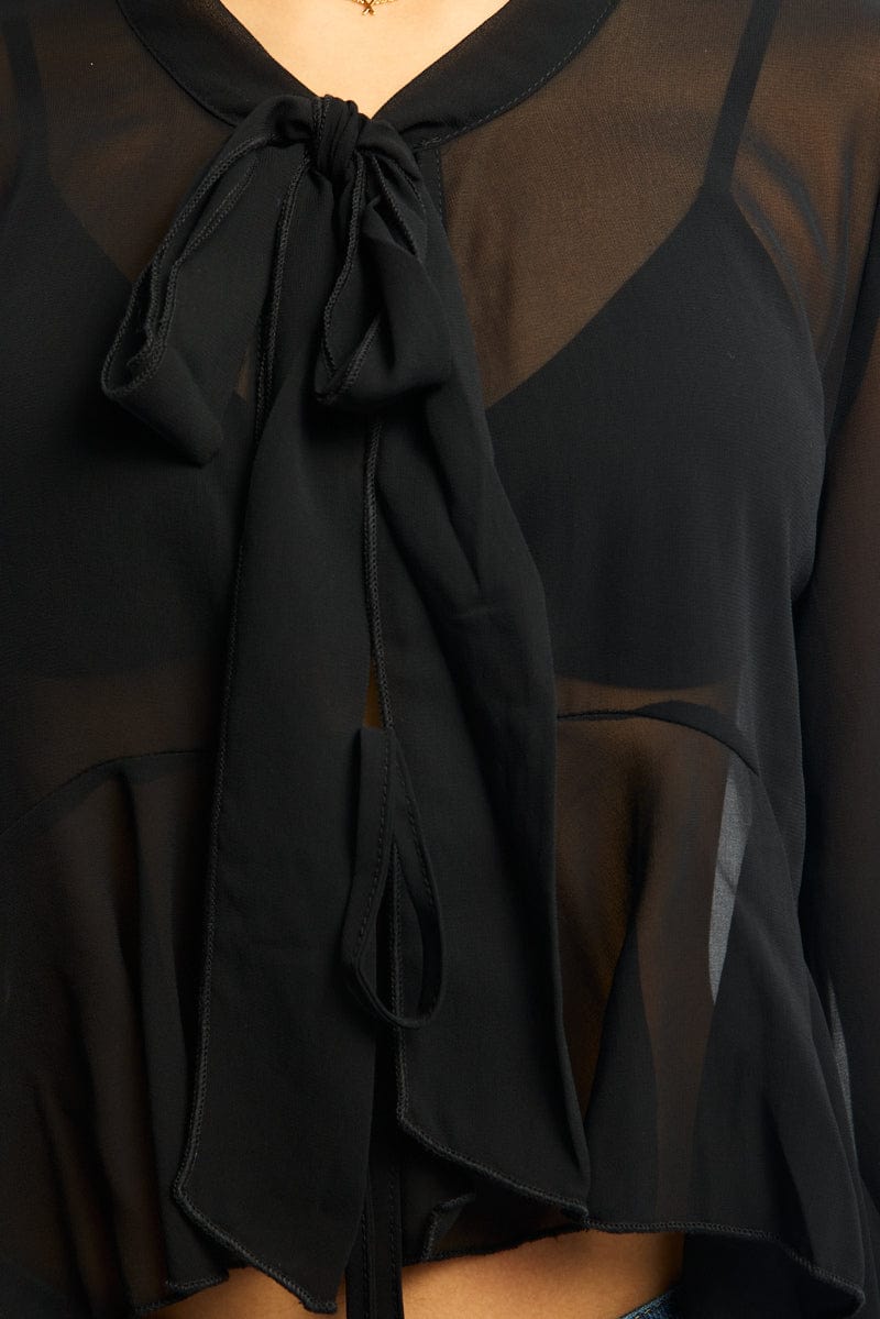Black Sheer Blouse Tie Neck Long Sleeve Ruffles