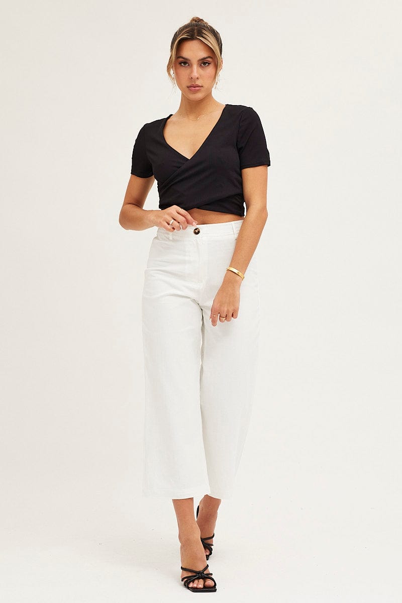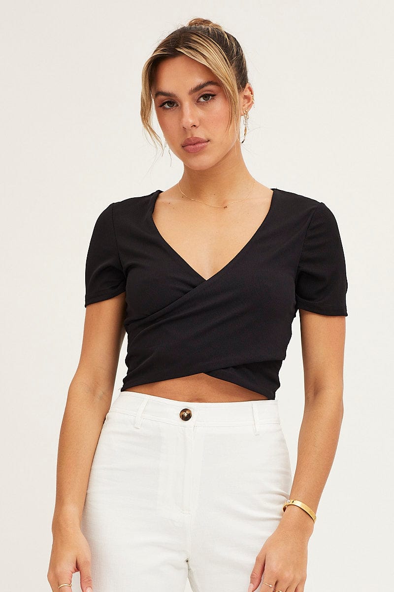 Black Short Sleeve V Neck Rib Jersey Crossover Top