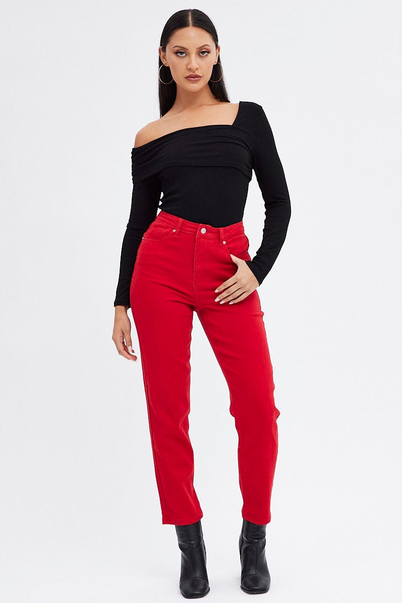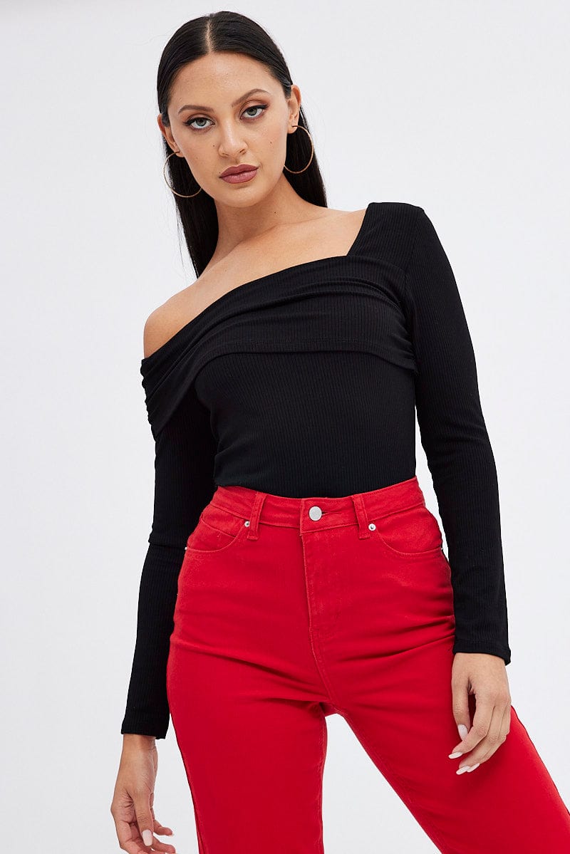 Black Top One Shoulder Long Sleeve Rib