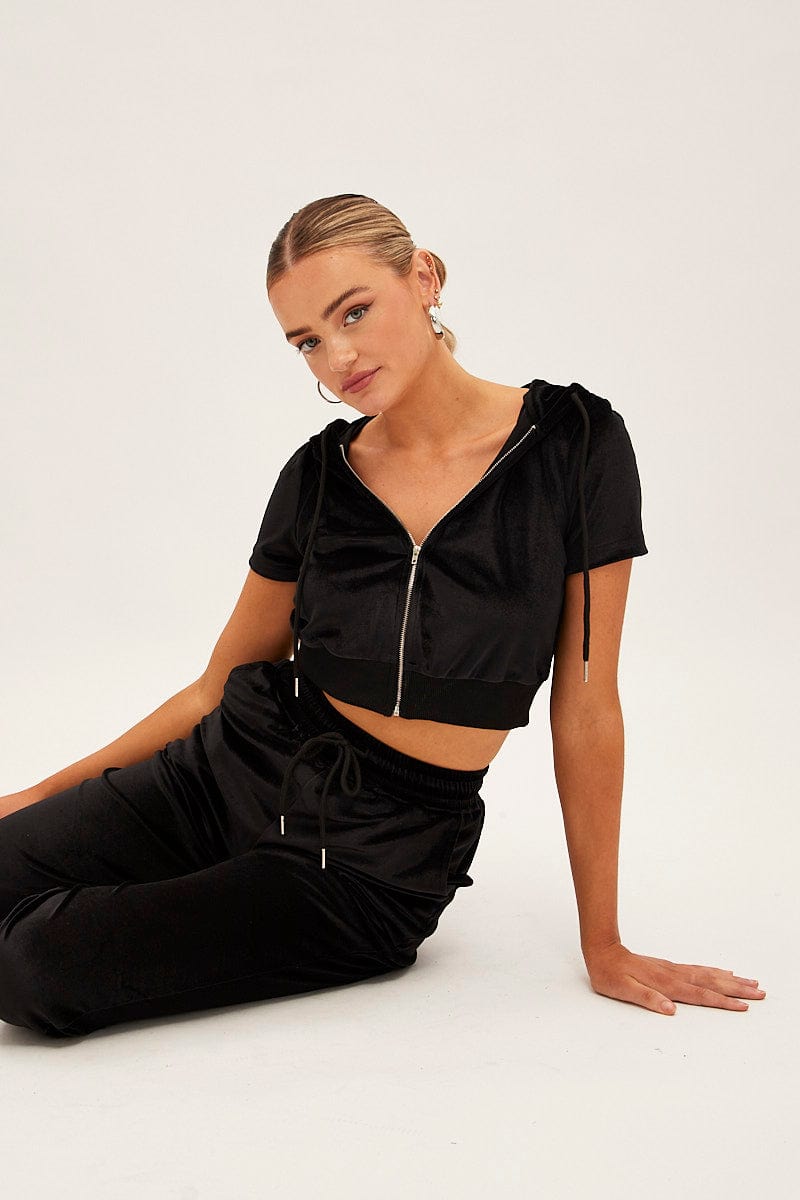 Black Velour Short Sleeve Zip Lounge Hoodie