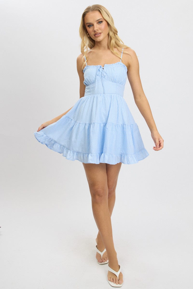 Blue Check Fit and Flare Dress Sleeveless Tiered