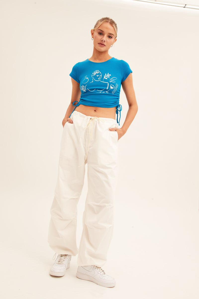 Blue Crop Top Short Sleeve Crew Neck Ruched Rib