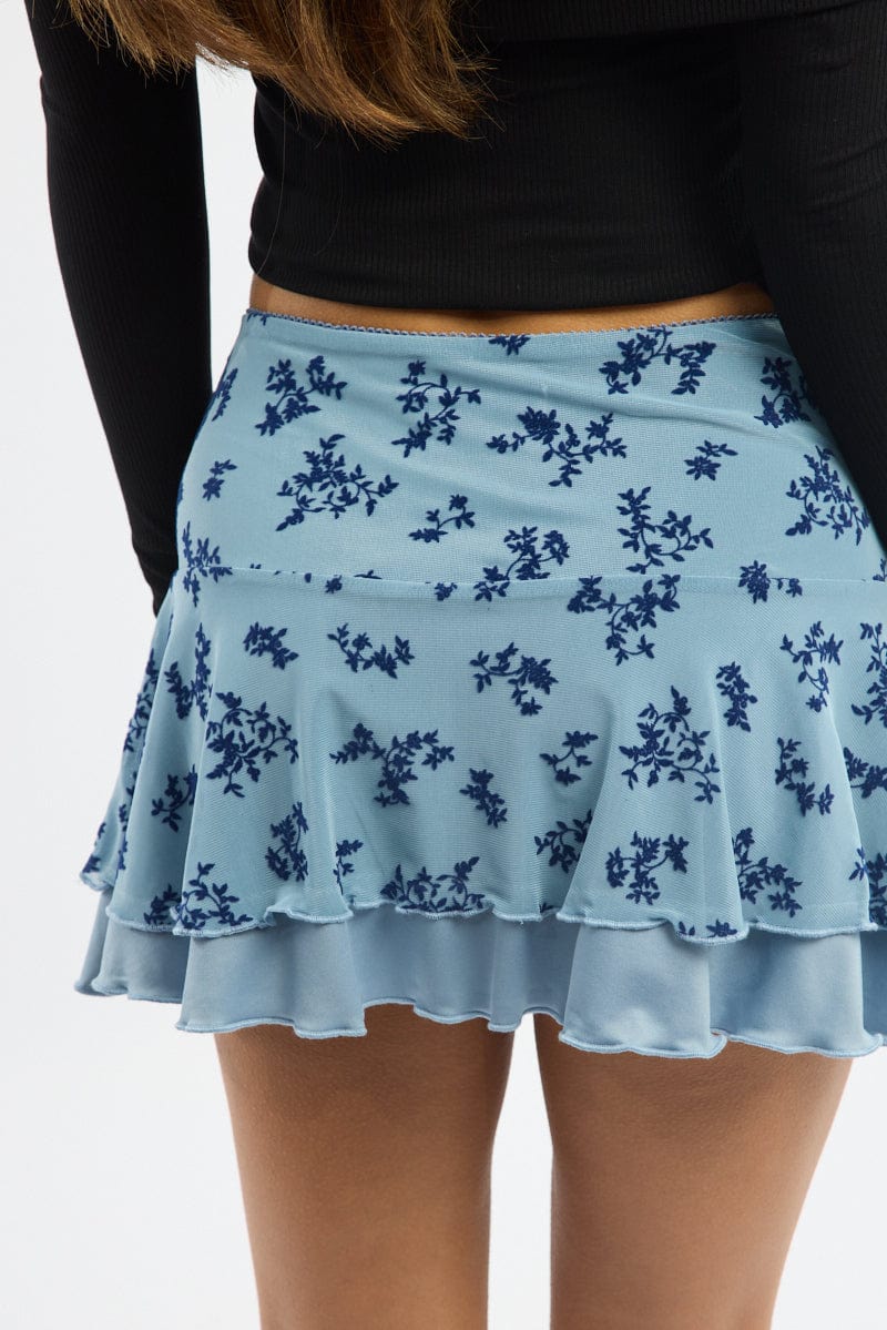Blue Floral Mini Skirt Elastic Waist Skater Layered Burnout
