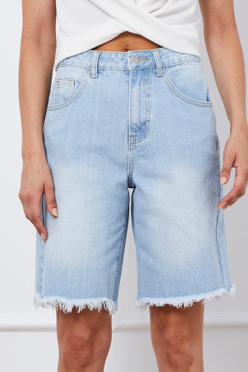 - High Rise, Knee Length, Light Wash, Raw Hem