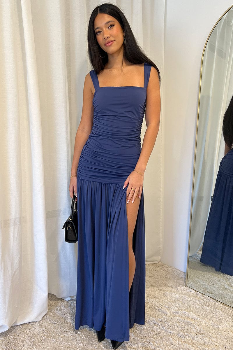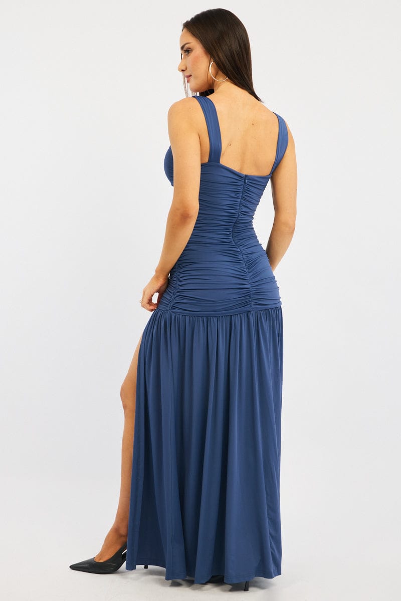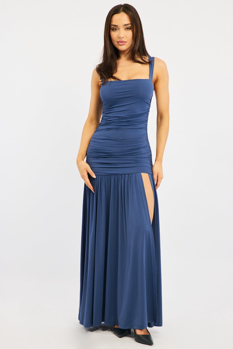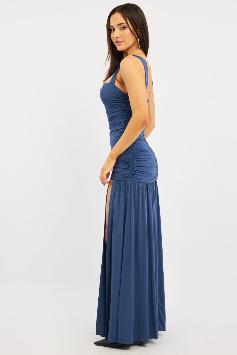 - Ruched Sides and Back, Back Zipper, Front Leg Split, Lining