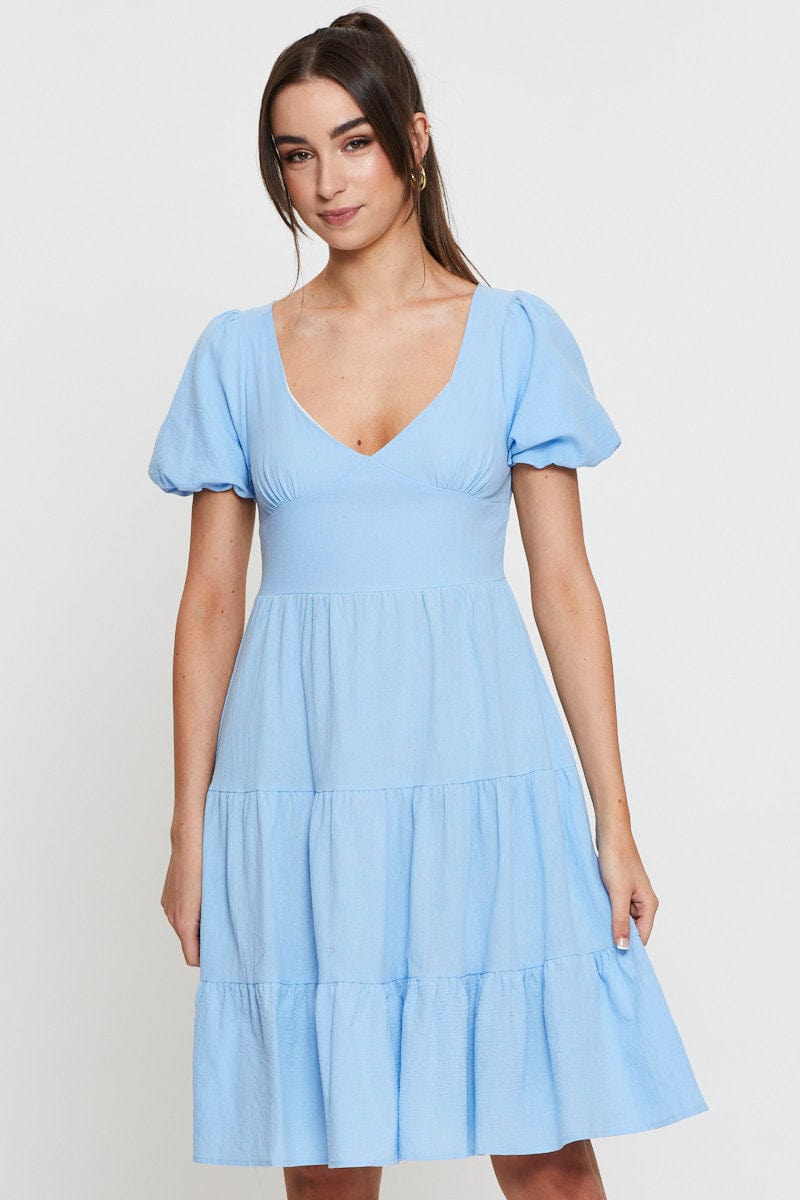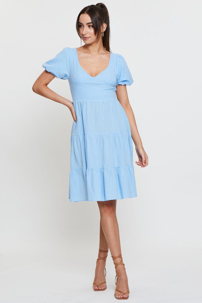 - Puff Sleeves, Knee Length, Tiered Design, Back Zip Closure