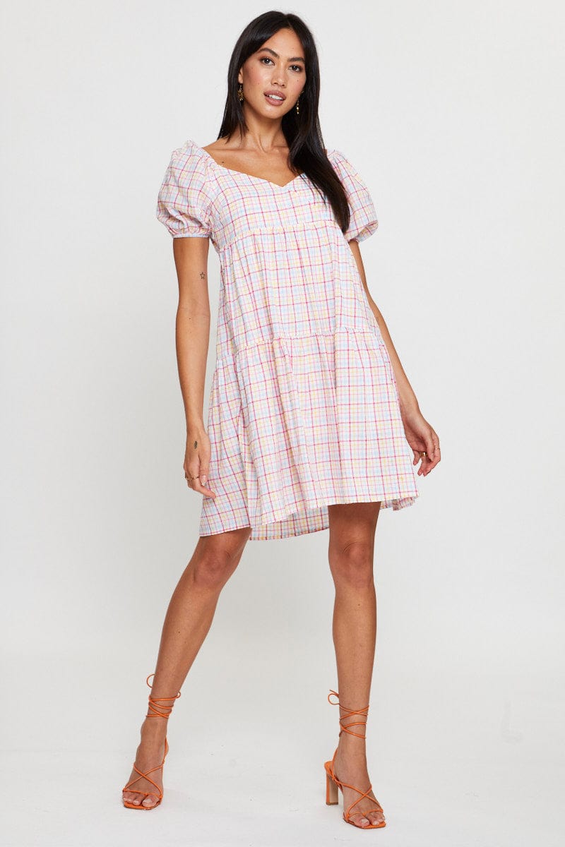 - Check Print, Puff Sleeves, Relaxed Silhouette, Mini Length