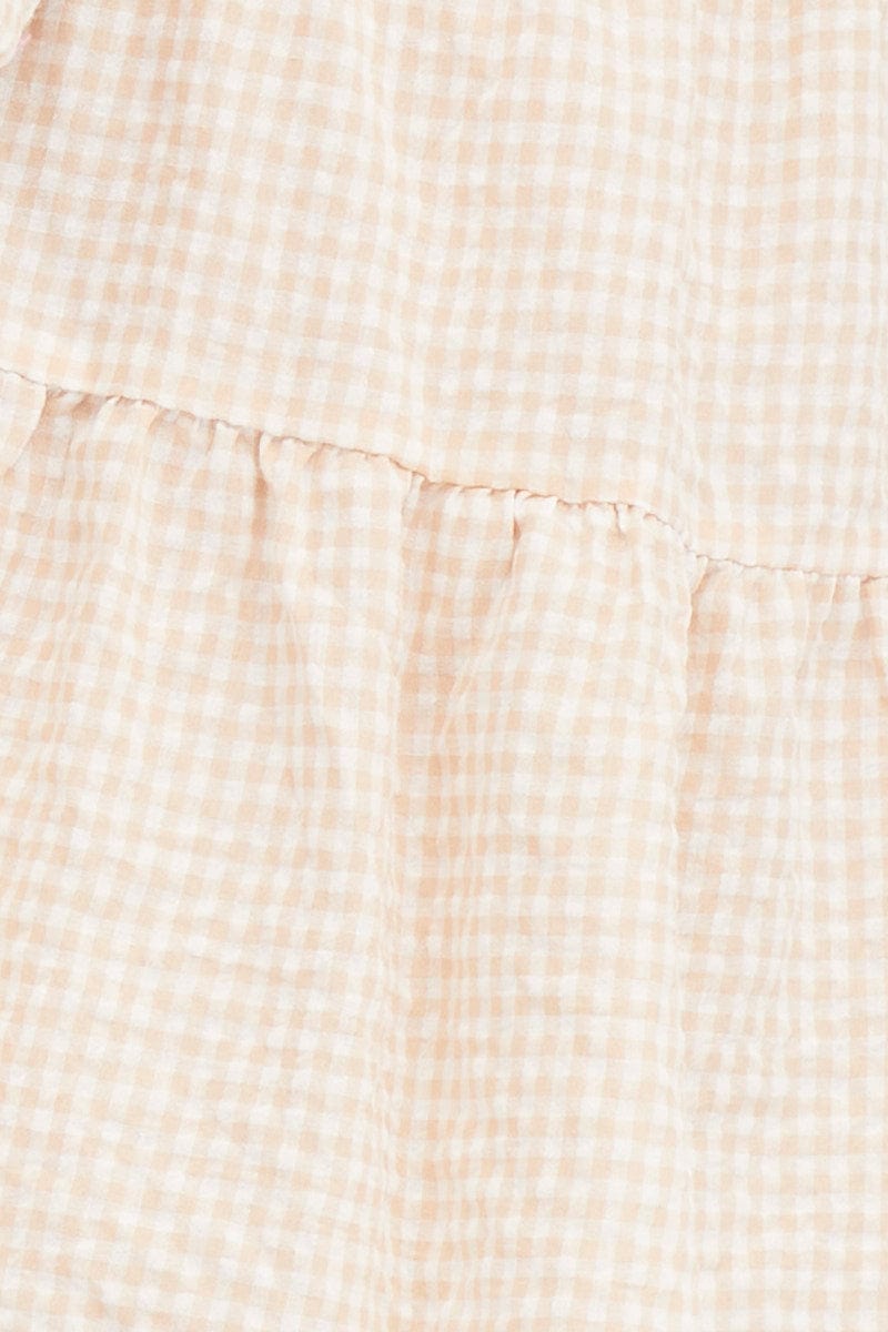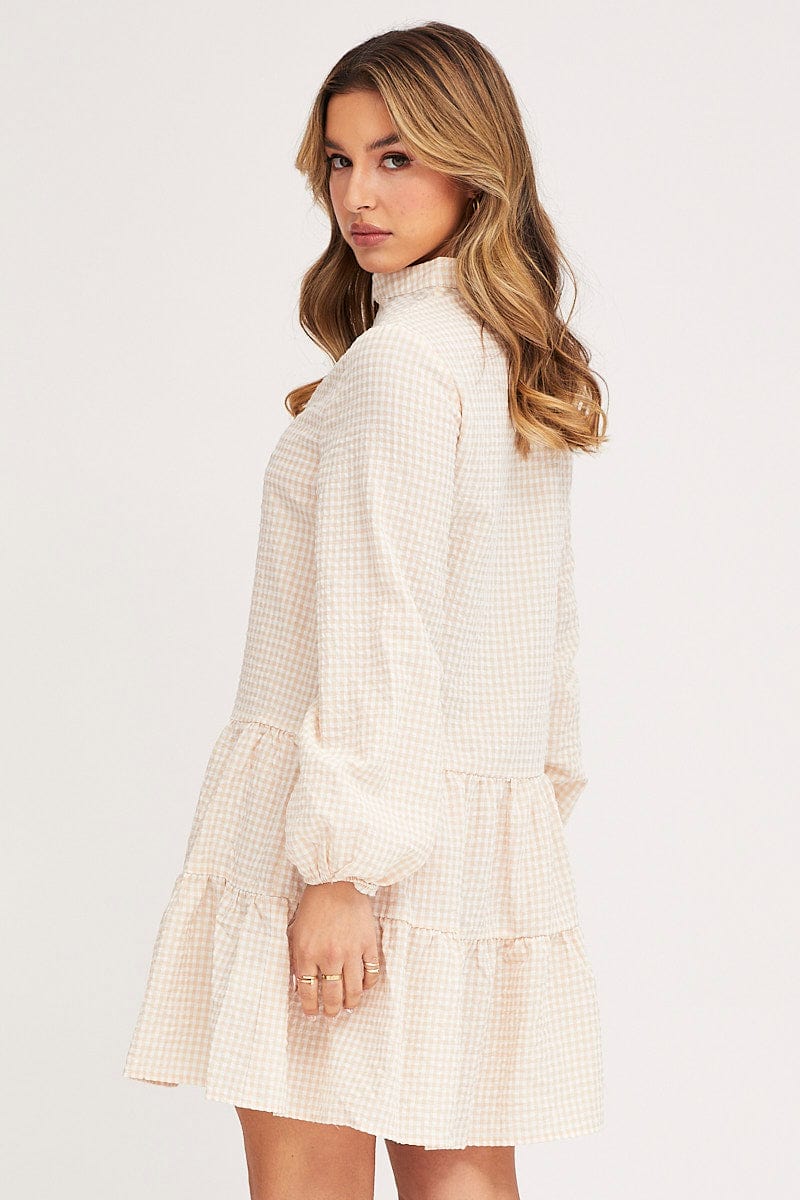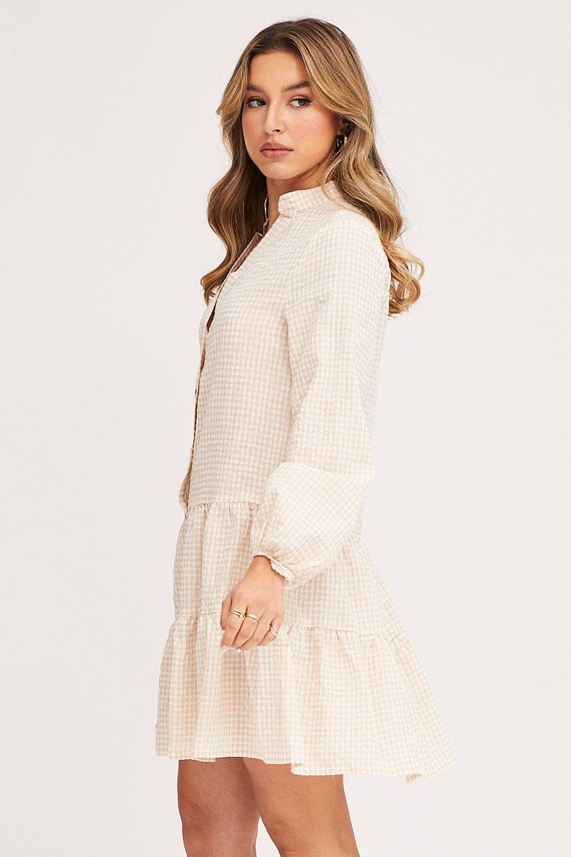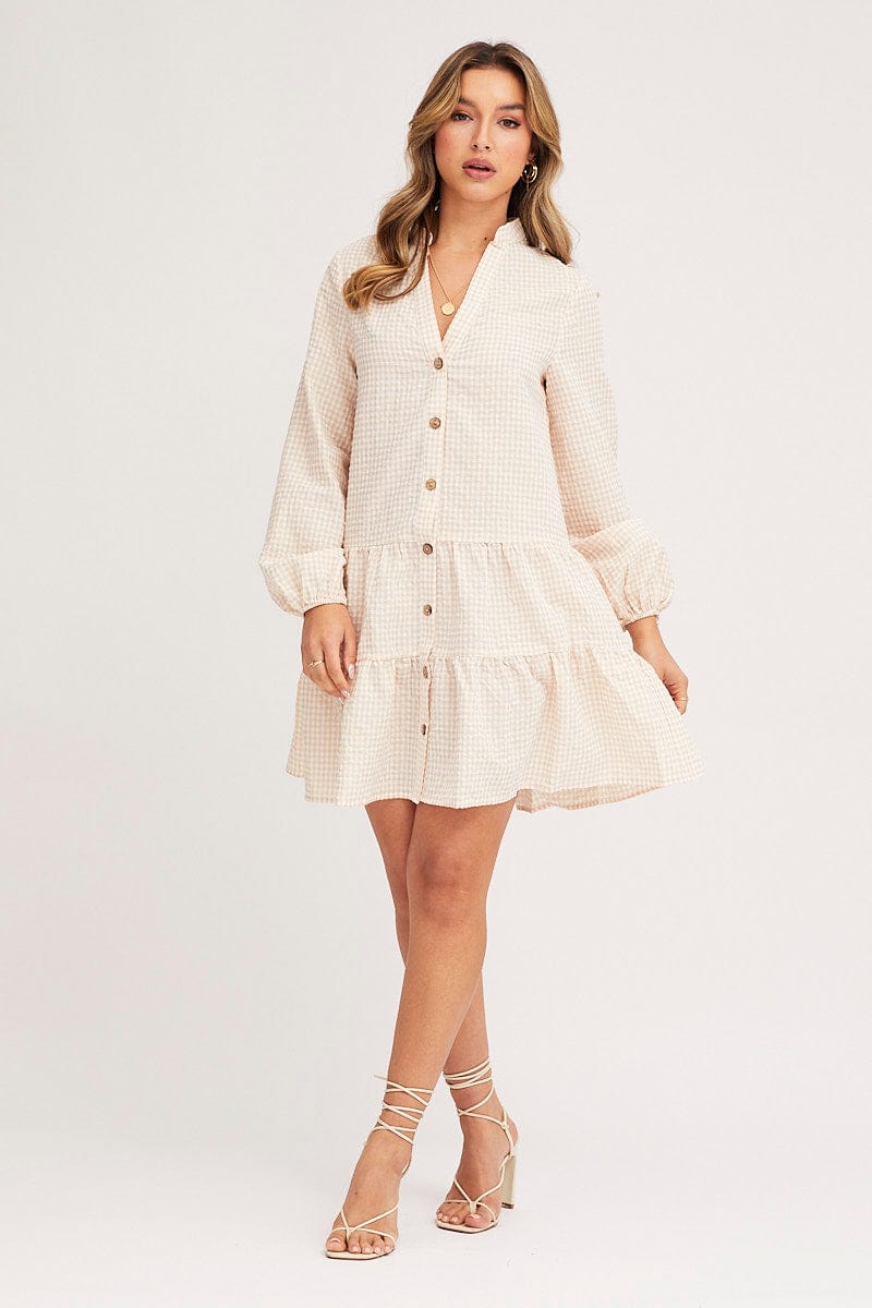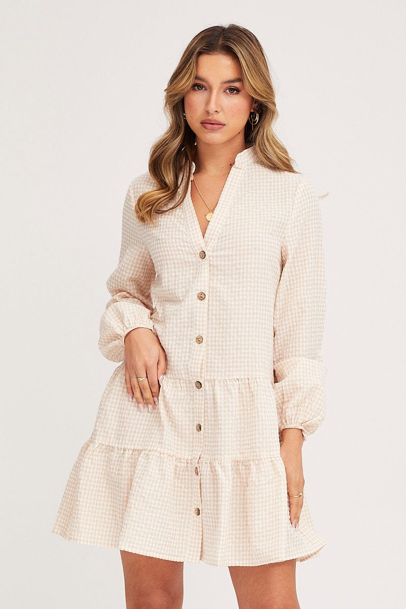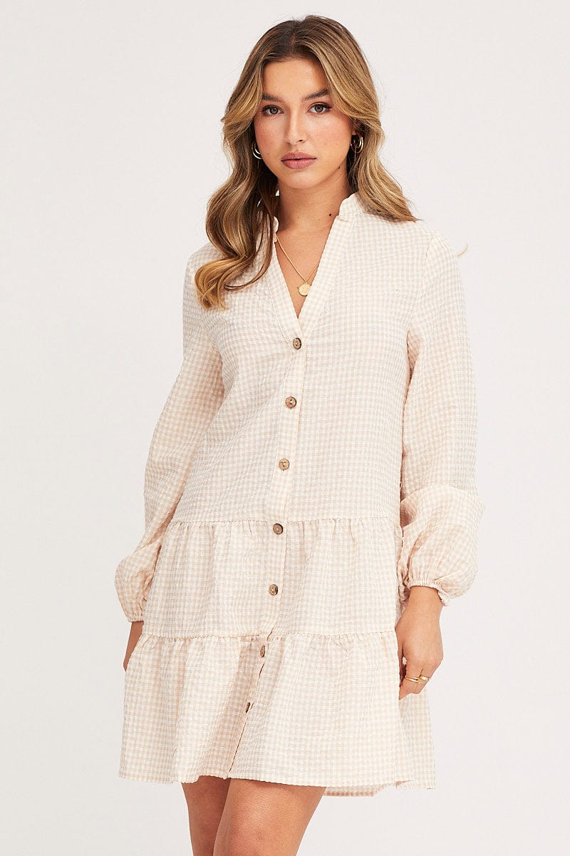 - Gingham Print, Tiered Design, Button Front, Volume Sleeves