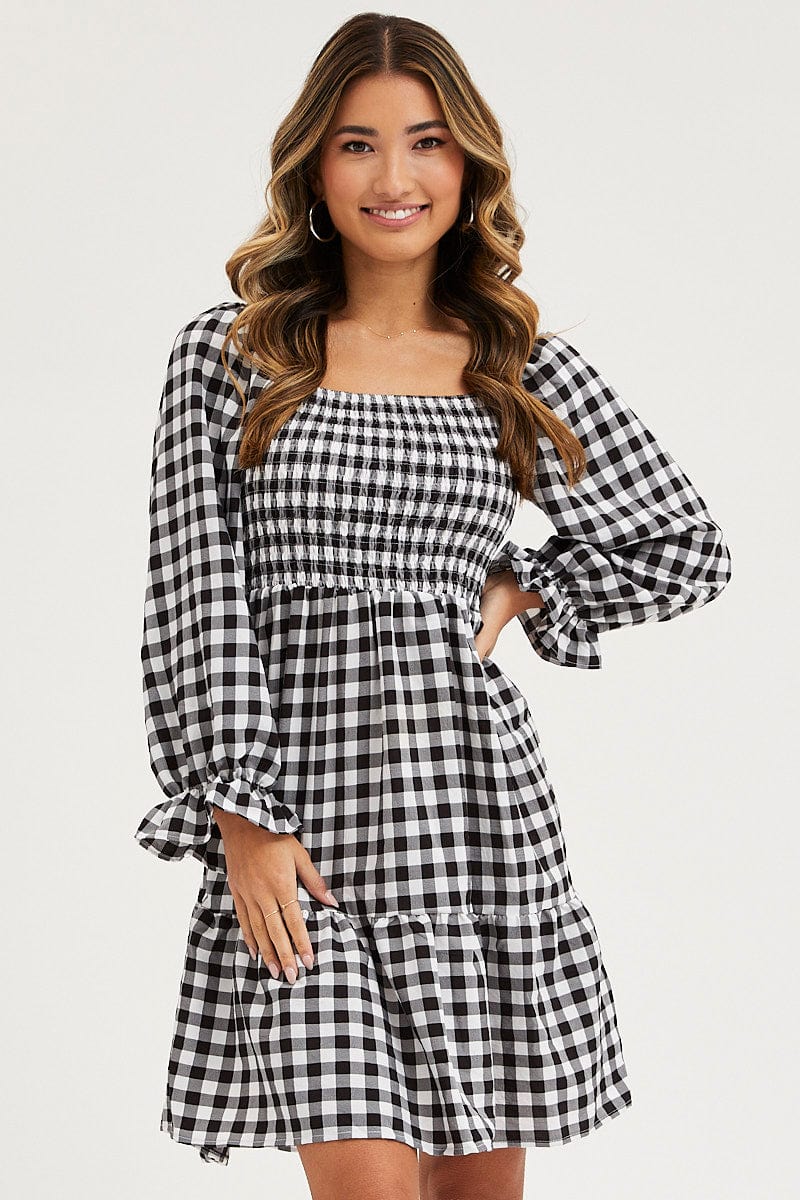 Check Skater Dress Puff Sleeve Mini