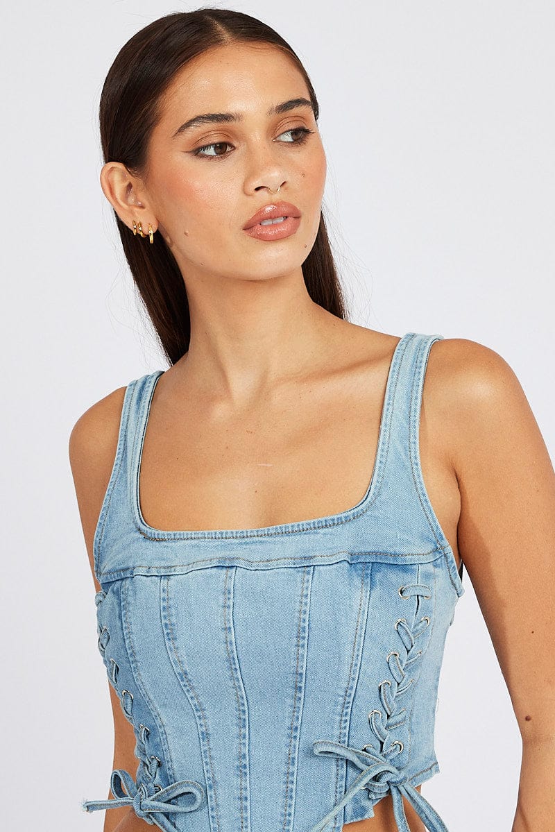 Denim Corset Sleeveless Scoop Neck Lace Up Stretch