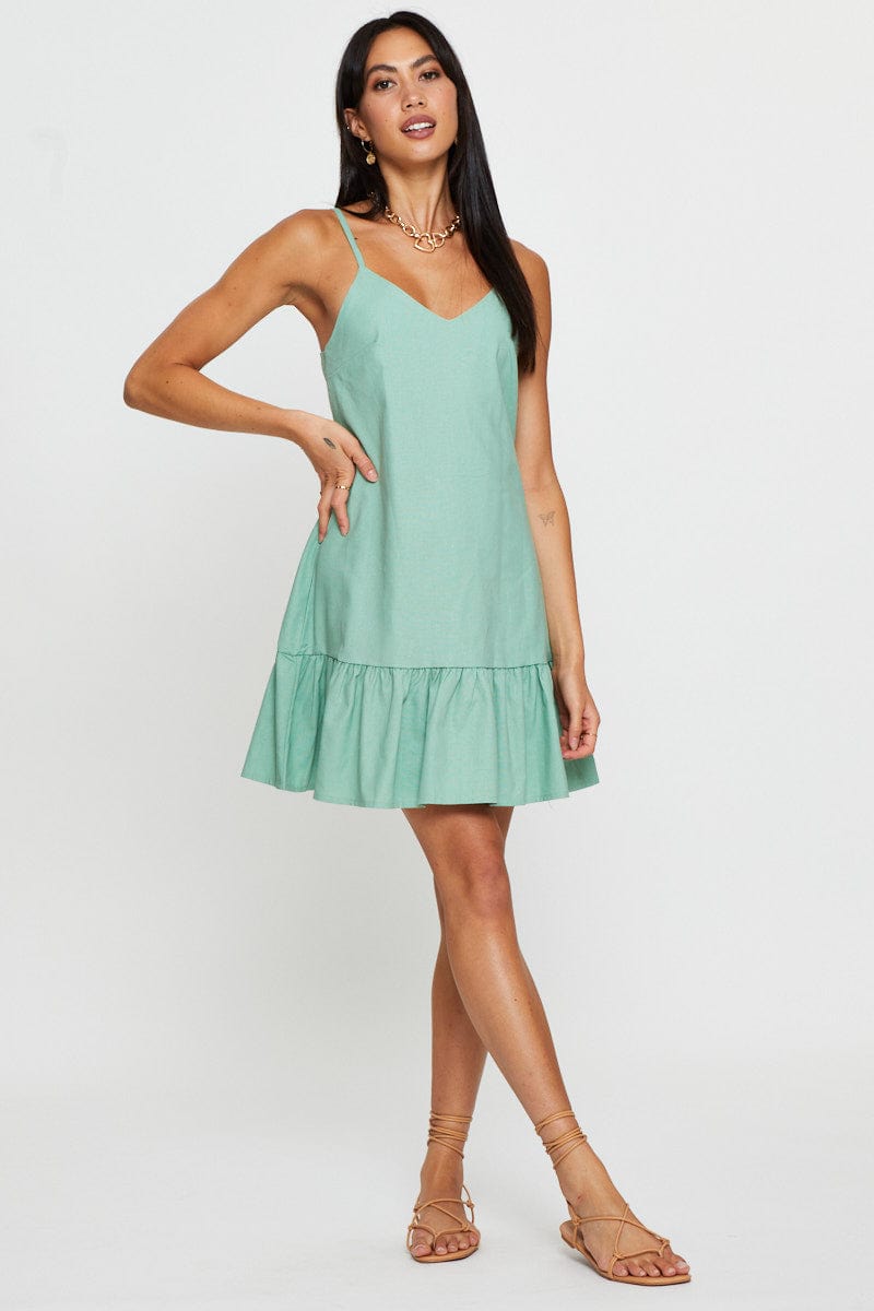 Green A Line Dress Mini V Neck
