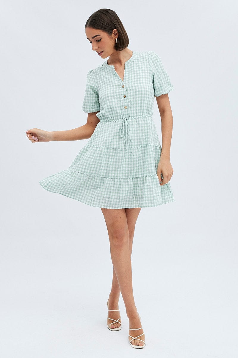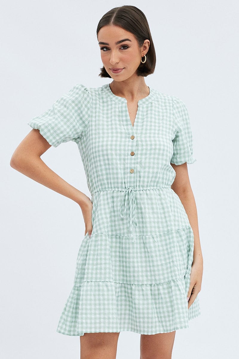 Green Check Shirt Dress Short Sleeve Tiered