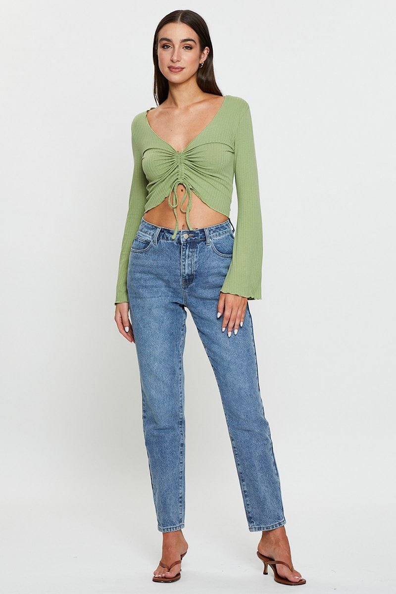- Ribbed Material, Flare Sleeves, V Neckline, Ruched Bust