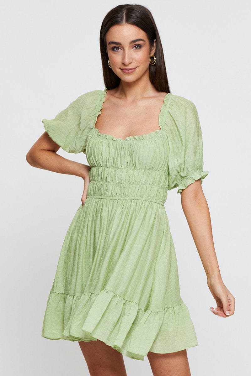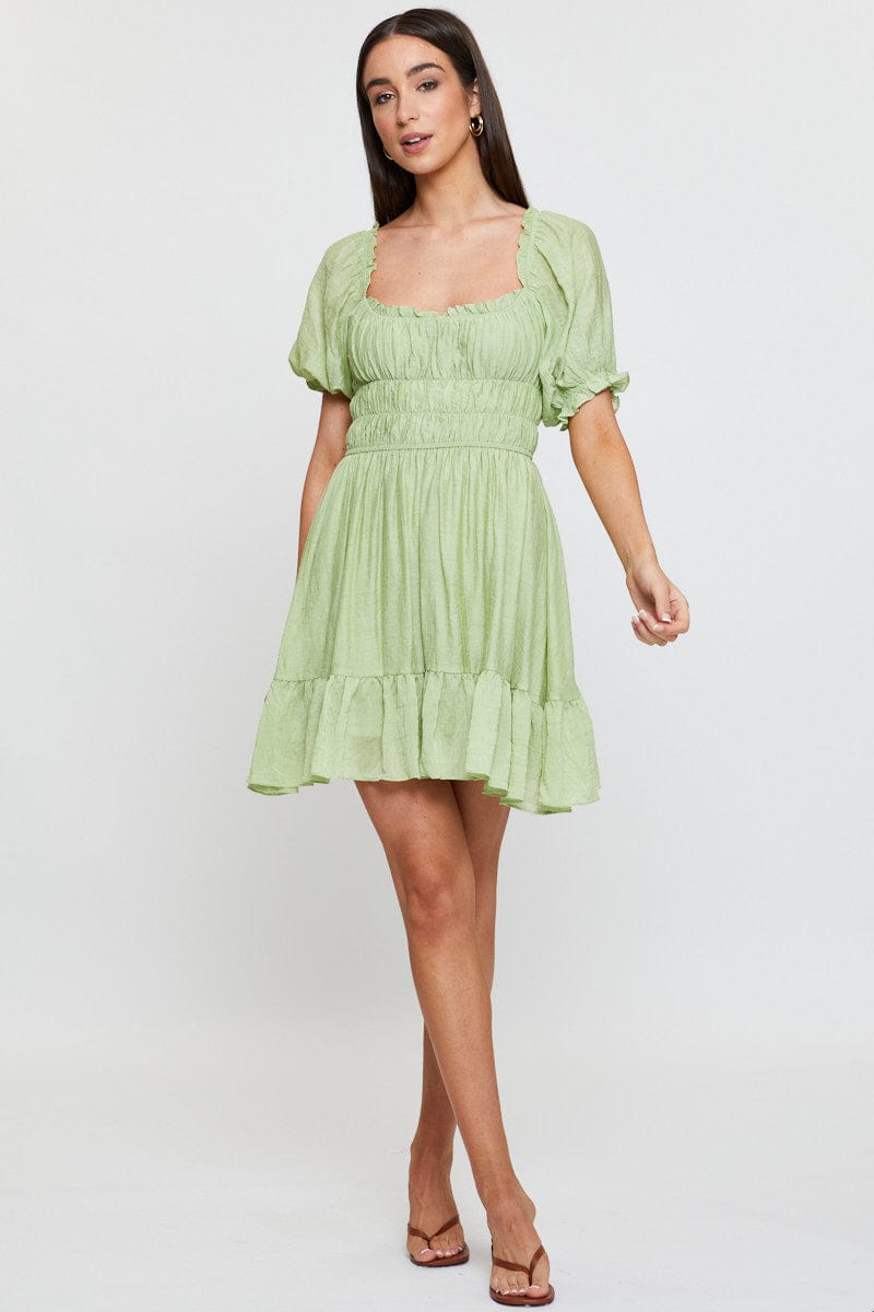 - Shirred Bodice, Frill Hem, Off Shoulder, Puff Sleeves