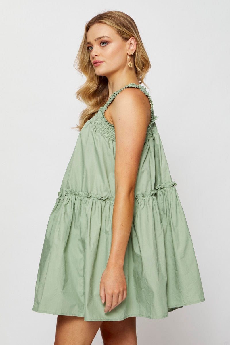 - Ruffle Detail, Square Neckline, Mini Length, Shirred Detail