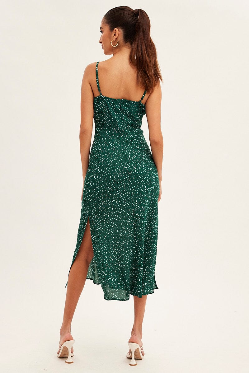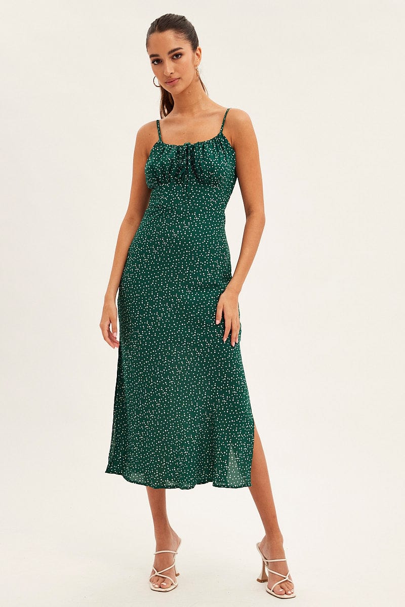 Green Polka Dot Midi Dress Sleeveless Ruched Bust
