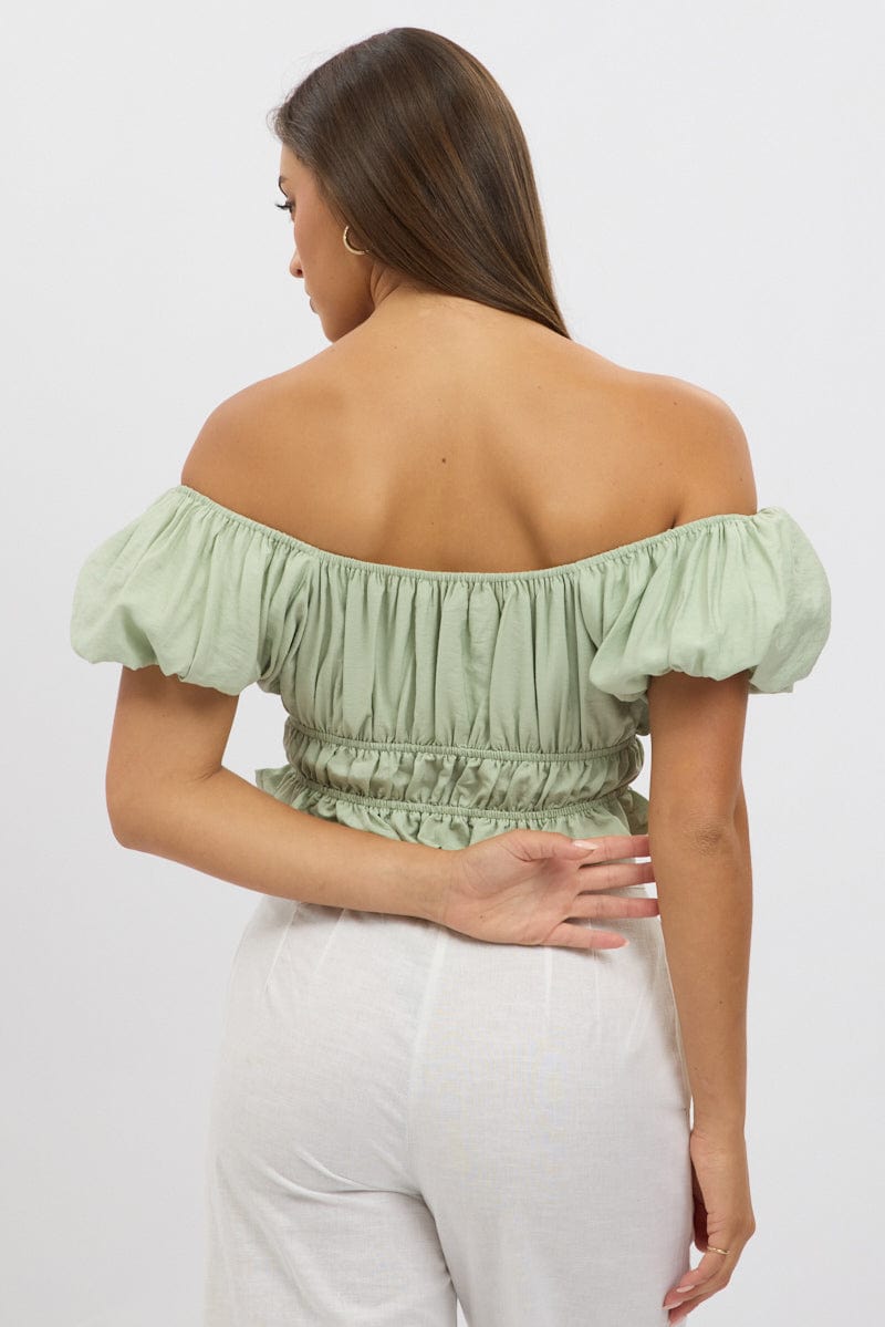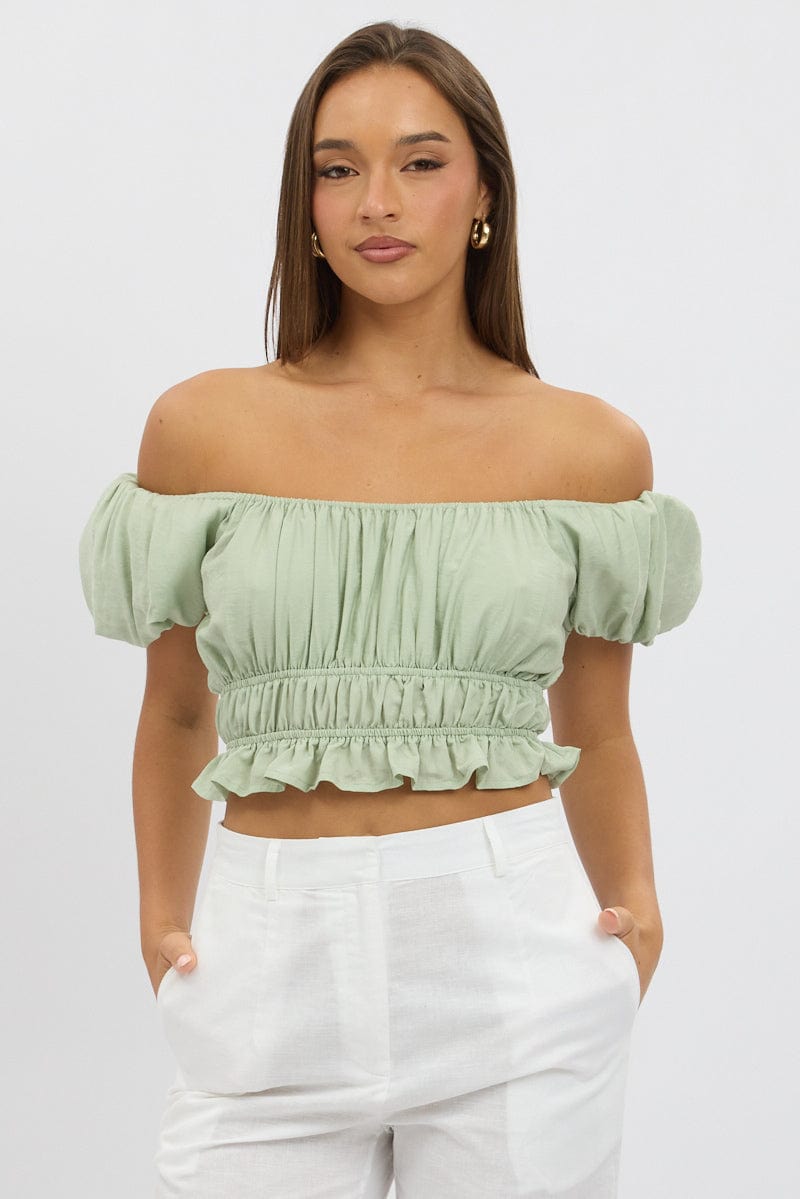 Green Ruffle Crop Top Puff Sleeve