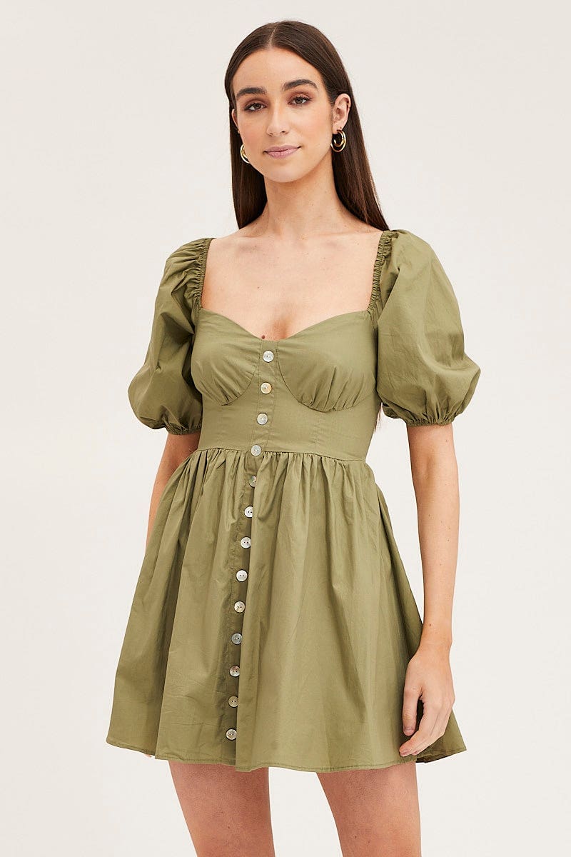 Green Skater Dress Puff Sleeve Mini Sweet Heart Neck