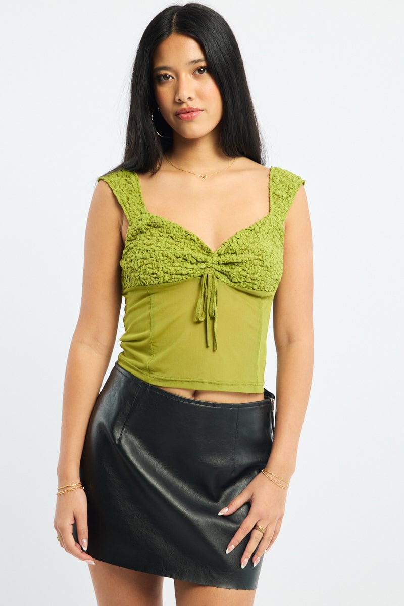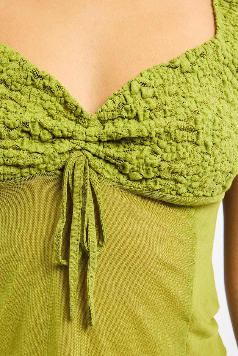 - Textured, Mesh Overlay, Front Ribbon Tie, Sheer